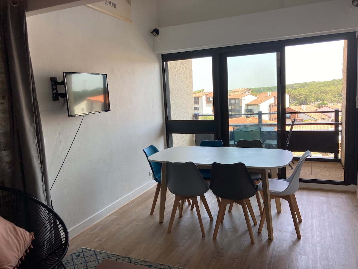 Au pied du Golf et des plages : appt 3 pièces duplex 2 à 6 pers. avec séjour, cuisine équipée, salle d'eau avec WC, chambre lit double, cabine 2 couchages, sdb avec WC. Actuellement en travaux : façade et peintures extérieures. Le plus : TV, Wifi, lave-vaisselle, piscine chauffée (selon saison) activités de loisirs (golf, surf, vélo). Linge de lit sur demande (sup. 40€). Terrasse vue pinède, parking gratuit. La résidence se situe au coeur de la pinède avec vue sur le golf et accès à la plage.