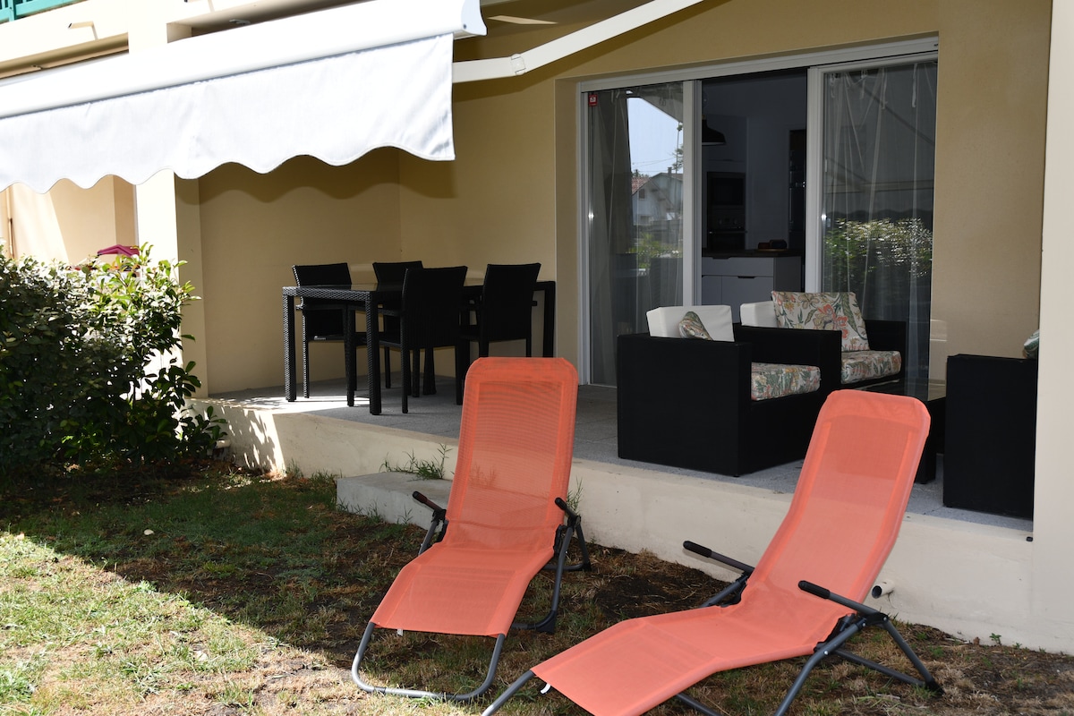 Venez vous détendre au calme dans notre T2 tout neuf de 26m2. Situé entre les Landes et le Pays Basque, à 5min de la plage et 20min de la frontière Espagnole. Proche de toutes commodités : Boulangerie, Hypermarché, Cinéma, trambus... Logement composé d'une cuisine équipée avec four, plaque induction, micro-ondes, lave linge etc.. Salon, canapé,TV et WiFi. Chambre avec couchage double, penderies et salle d'eau. Parking privatif Jardin paysager privatif avec terrasse salon de jardin, plancha....