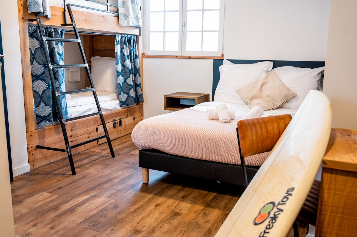 Well-appointed, these 11 - 13sqm rooms are ideal for two people. Bright and refreshing like the Atlantic, simple and warm like a vacation home, the rooms are characterized by natural materials and soft colors. The wall decor is the result of a collaboration with the Departmental Archives of the Pyrénées-Atlantiques.