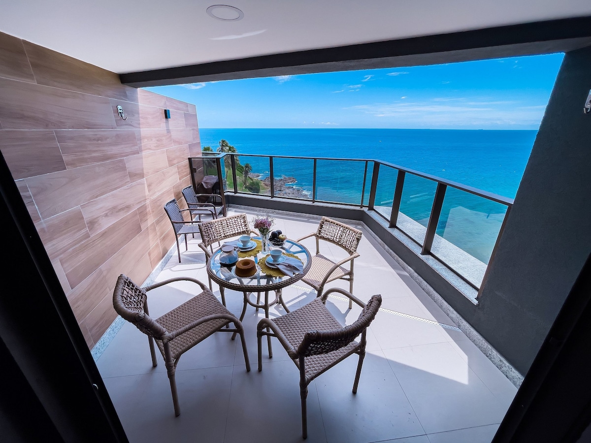 Apt na Barra (bairro turistico) de Salvador, vista mar panorâmica, paralelo ao circuito do Carnaval. 2 min de caminhada ao Farol da Barra. O quarto e sala acomoda até 04 pessoas (quarto cama queen e sala com sofá-cama). Ar condicionado e smart TV em todos os cômodos. Cozinha completa com fogão, forno, microondas, geladeira, filtro de água, cafeteira Nespresso e todos os utensílios Automatizado por Alexa 1 vaga de garagem, rooftop com piscina e academia Lavanderia no térreo PROIBIDO FUMAR