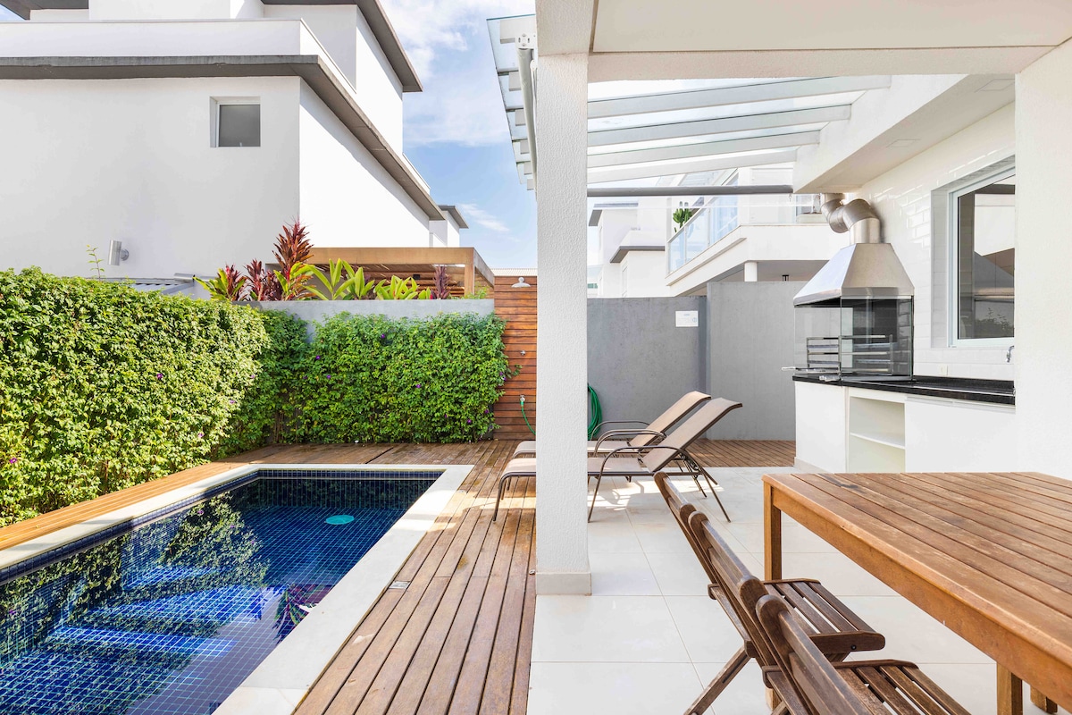 * Casa de 200m2 moderna e clean, pet friendly(100% cercada), c/academia, 4 suites, ar cond, 2 TVs(sala/suite) em area nobre de maresias, tendo a peh mercado, farmacia, padaria e restaurantes. * Piscina e churrasqueira privativas, num condominio pe na areia c/7 casas e seguranca/portaria 24hs. * A casa possue roupa de cama completa/toalhas, filtro de agua, airfry, wifi, cafeteira, 110V, maq de lavar, utensilhos de cozinha/churrasco, guarda sol, cadeiras de praia e 2 vagas de garagem.