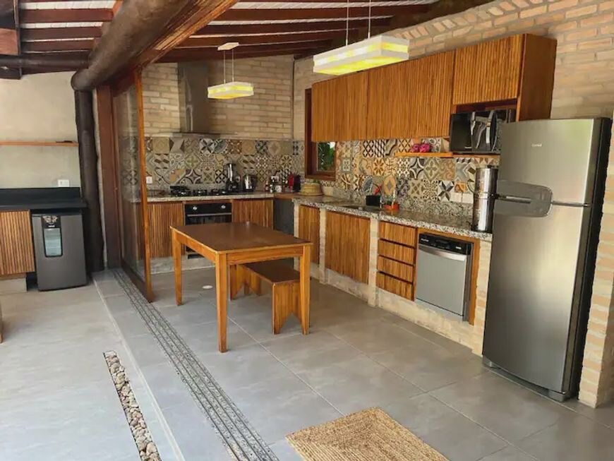 A poucos passos da praia, esta casa tropical cercada por grande jardim é um refúgio perfeito para famílias. Com 4 dormitórios, a casa acomoda até 10 pessoas. Há suíte no térreo, ideal para idosos ou pessoas com mobilidade reduzida. Todos os ambientes têm ar-condicionado, inclusive a cozinha, e a sala conta com lareira aconchegante. Os espaços externos são destaque, com terraço coberto, mesa grande, sofás, redes e churrasqueira, além de jardim tropical iluminado à noite.