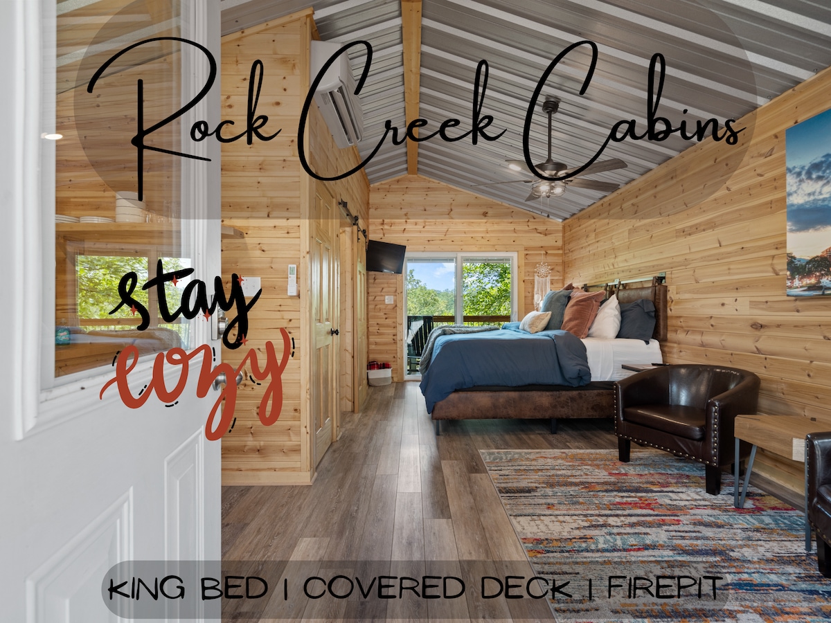 This Lodge Style Cabin is the Perfect Place to Enjoy a Few Days in Hot Springs! From the Pine Clad Walls, to the Covered Back Deck overlooking the Property, you will Decompress the Moment you Walk through the Front Door... this Rustic Modern Retreat features a Sitting Area, Kitchenette, King Size Bed with Comfy Linens and an EnSuite with a Custom Walk-in Shower! You will Love Sitting on the Back Porch with your Morning Coffee and Planning your Adventure for the Day!