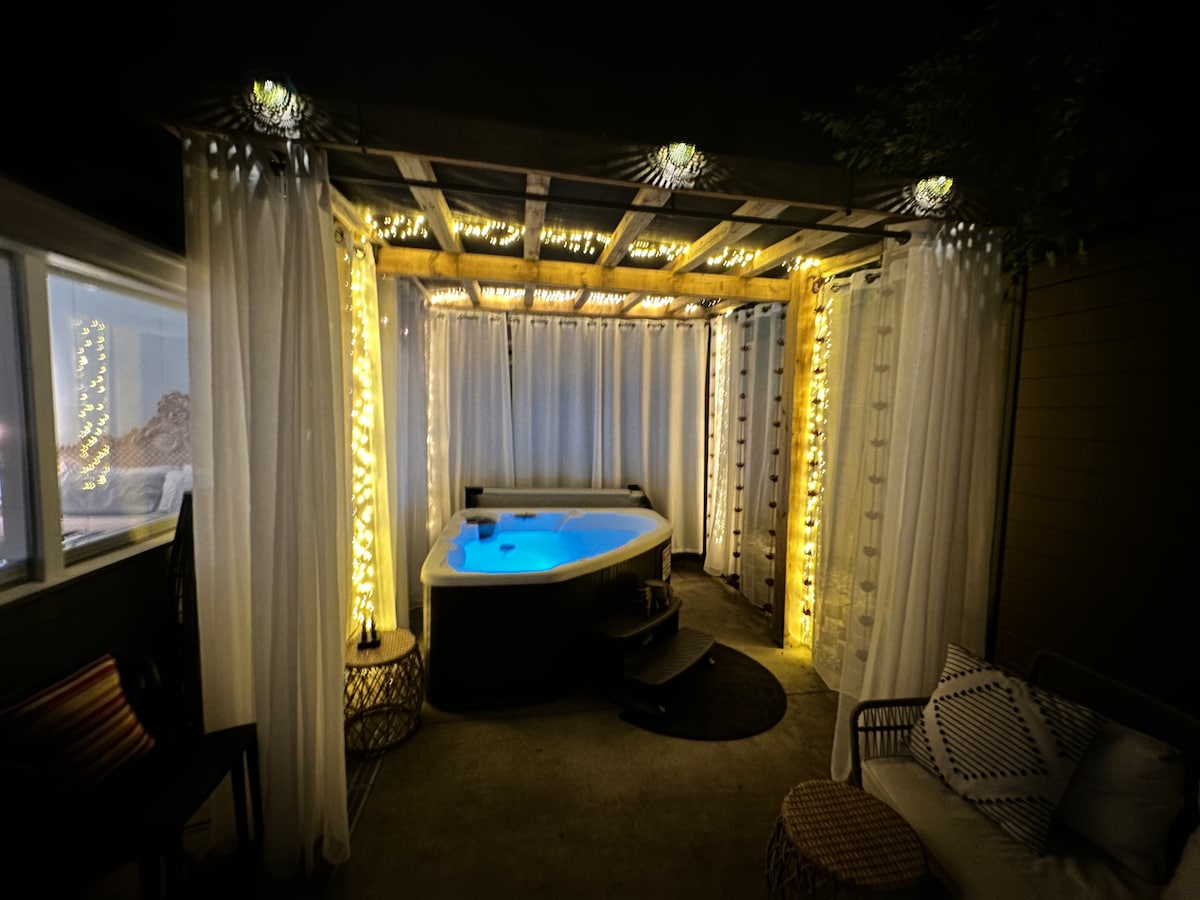 Welcome to the Namaste Studio, a serene lakeside retreat in the heart of Hot Springs, renowned for its quartz crystals. Unwind in our **Quartz Serenity Soak**, a crystal-inspired hot tub surrounded by glowing quartz decor, lush greenery, and the calming sounds of the lake. Soak under the stars with LED-lit crystals casting a magical glow, perfect for meditation, relaxation, or a romantic evening. Enjoy cozy seating and the spiritual energy of Hot Springs’ famous crystal