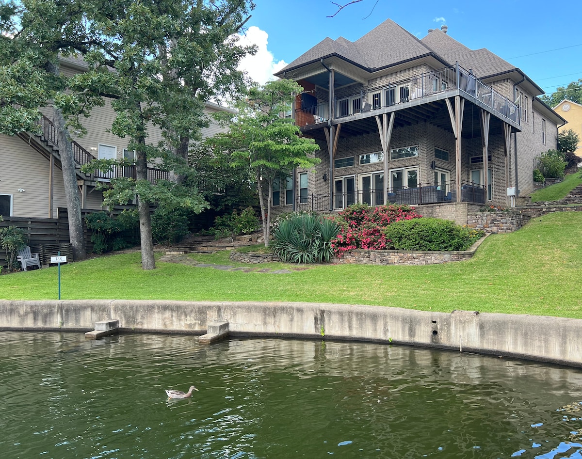 Experience Hot springs with breathtaking Lake views from either of 2 balconies! 2 bedroom 2 bath +2 half baths. Boat dock!! Fishing. New construction so new stainless appliances, new furnishings, 1 king bed, 1 queen, and a twin area for kids! (Blow up beds available). Sleeps 6-8. Washer/dryer on each floor (2 levels), walk in closets, bamboo wood floors, jacuzzi tub/shower, dishwasher, all kitchen supply's, coffee pot, outdoor table for eating or coffee at sunset, deck by the water with fire pit, and more. Minutes from Oaklawn racing and shopping! A must see!