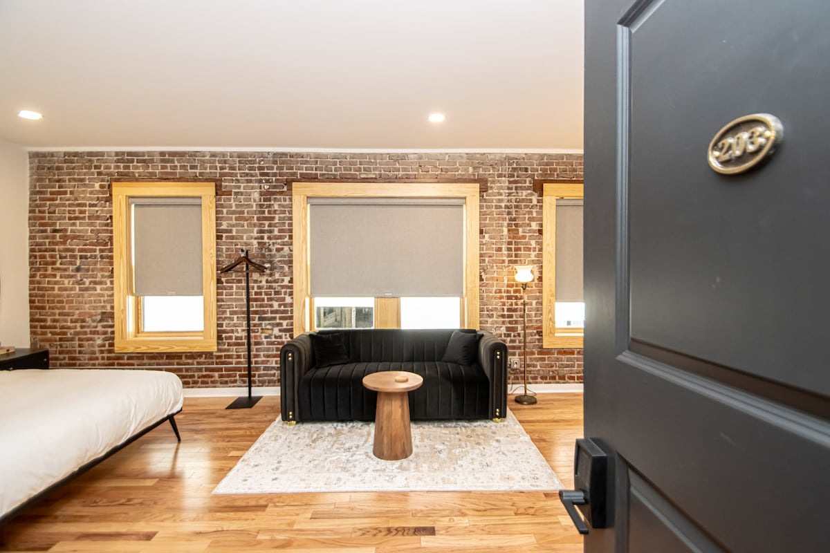 This gorgeous building sits in the heart of historic downtown Hot Springs. Its prime location, slice of history (on the National Register of Historic Places), & elevated style make it the perfect getaway! Walk to Bathhouses, Trails, Restaurants! KEY FEATURES: ☀ King-sized bed w/ high end Centium Satin linens ☀ Kitchenette w/ specialty coffee & cocktail equipment ☀ Shared front and back patio’s w/ fire pits ☀ 55” Roku TV w/ Hulu + Live subscription ☀ Fiber internet