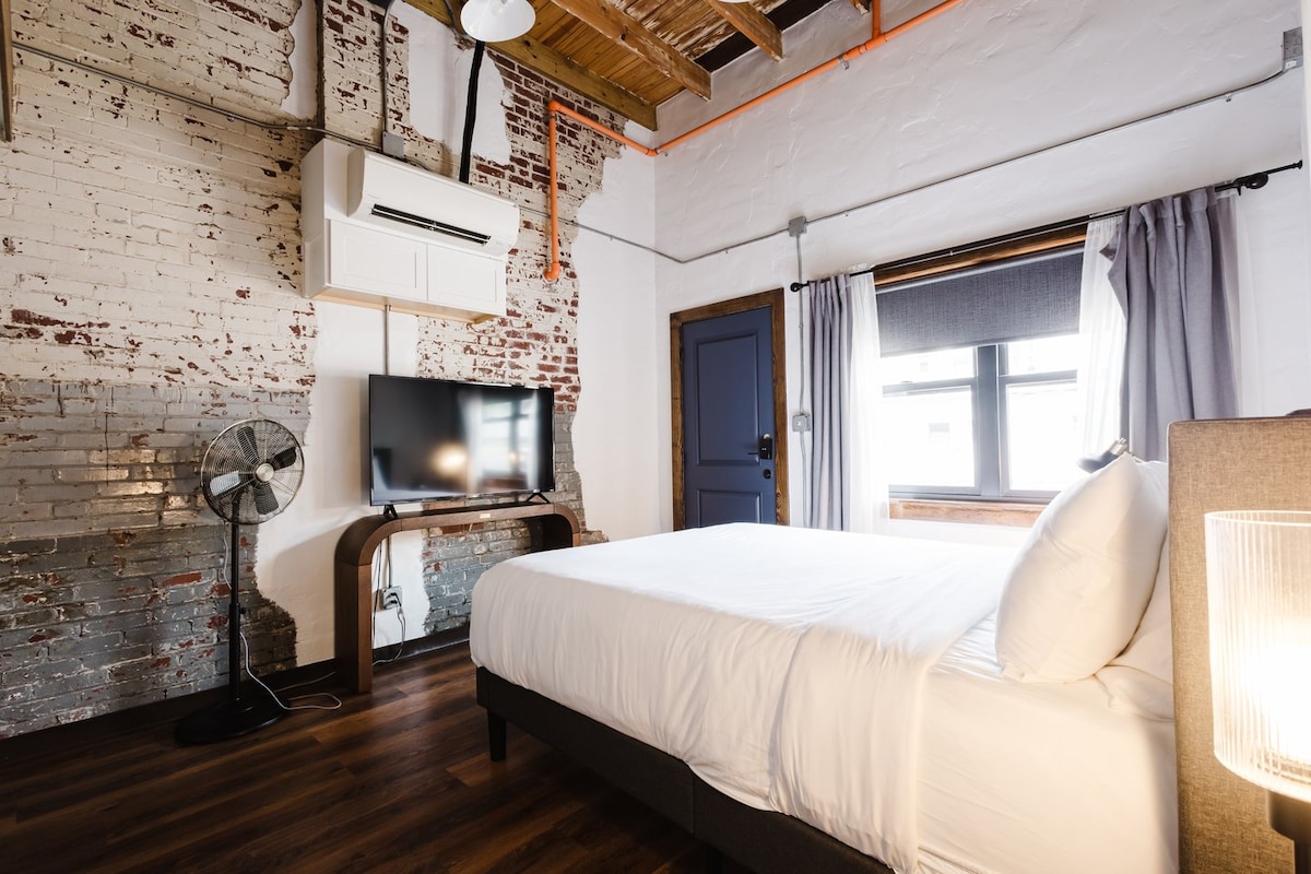 This gorgeous building sits in the heart of historic downtown Hot Springs. Its prime location, slice of history (on the National Register of Historic Places), & elevated style make it the perfect getaway! Walk to Bathhouses, Trails, Restaurants! KEY FEATURES: ☀ King-sized bed w/ high end Centium Satin linens ☀ Kitchenette w/ specialty coffee & cocktail equipment ☀ Shared front and back patio’s w/ fire pits ☀ 55” Roku TV w/ Hulu + Live subscription ☀ Fiber internet