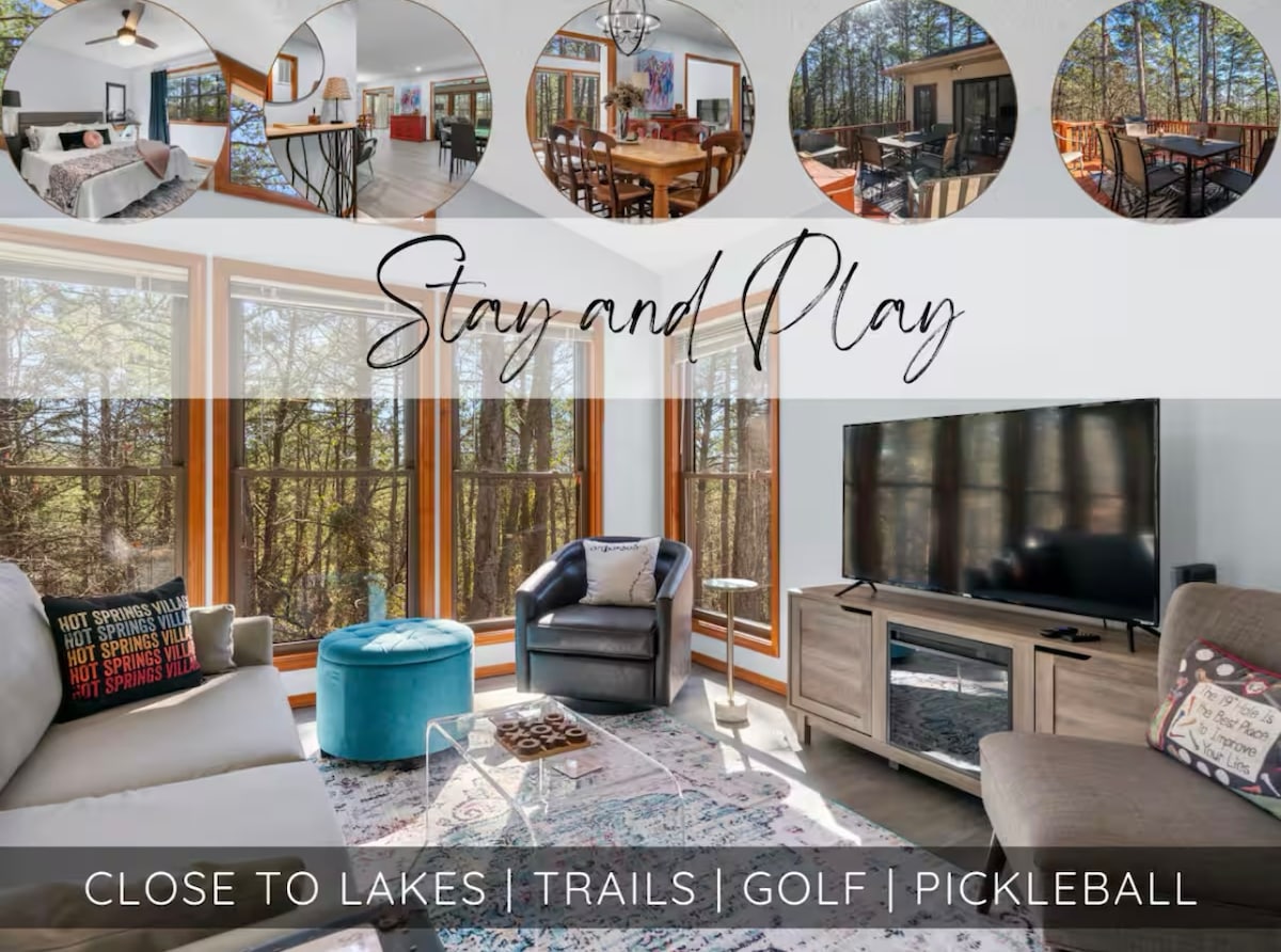 Forget your worries in this spacious and serene space. Near the lakes and golf courses in Hot Springs Village comes with the decorator’s heart in providing a comfy, relaxing atmosphere. Enjoy indoor livings and the outdoor patios overlooking the woods morning and evening. After exploring 11 lakes, 171 holes over 9 golf courses, tennis, pickle ball, 30 miles of hiking trails, swimming pools, boating, beaches, enjoy a tranquil rest here. $15/person/night after the 4th person.