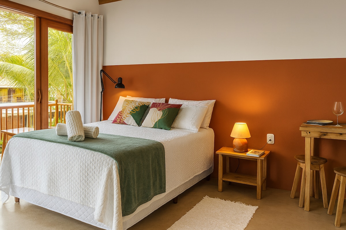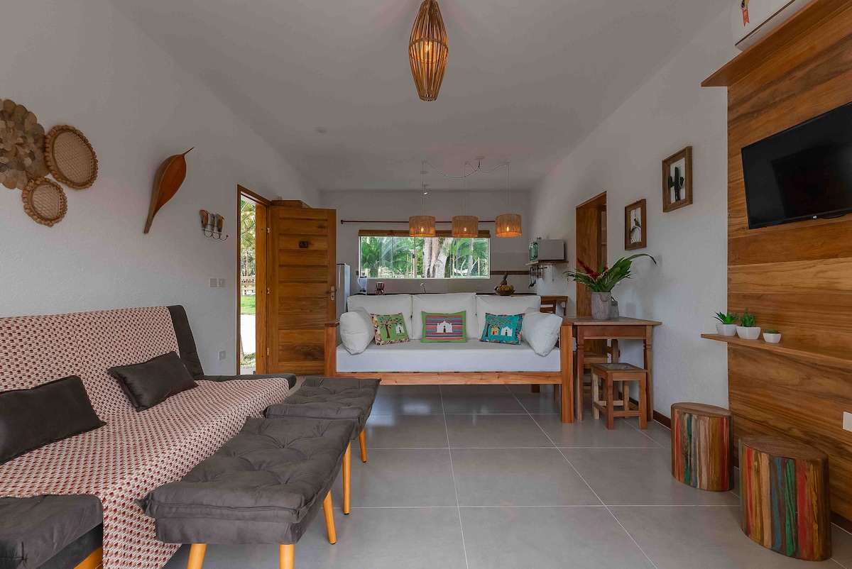 Bem vindos a Vila Dengo Trancoso! Nosso espaço foi cuidadosamente projetado para ser prático e acolhedor. Estamos a apenas 900 metros do Quadrado e a 1 km das praias mais próximas, Praia dos Nativos e Praia dos Coqueiros. O loft conta c/ uma cozinha equipada, um quarto bem ventilado com ar-condicionado, cama de casal e uma mesa para refeições. Além disso, possui duas sacadas: uma com rede e a outra com duas cadeiras e mesa , perfeitas para relaxar. @viladengotrancoso