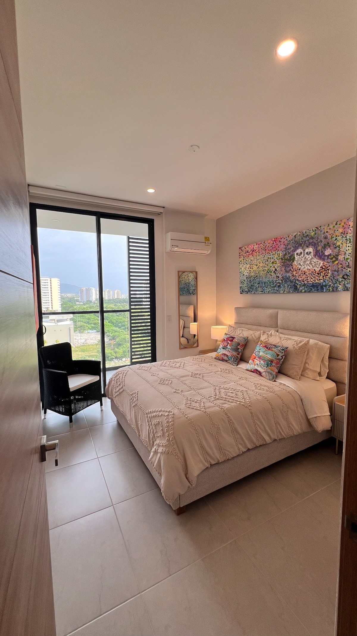 Espectacular apartamento moderno para estrenar en un piso 17 con vista al mar y salida directa a la playa. Espacio agradable para tomar vacaciones, descansar y/o trabajar home office. A 10 minutos del aeropuerto internacional y del centro histórico de Santa Marta, cerca a zona de restaurantes, bares, centros comerciales y farmacias. A menos de una hora del Parque Nacional Tayrona, Taganga, Minca. El apartamento cuenta con un amplio balcón donde podrás disfrutar del mejor atardecer de Colombia.