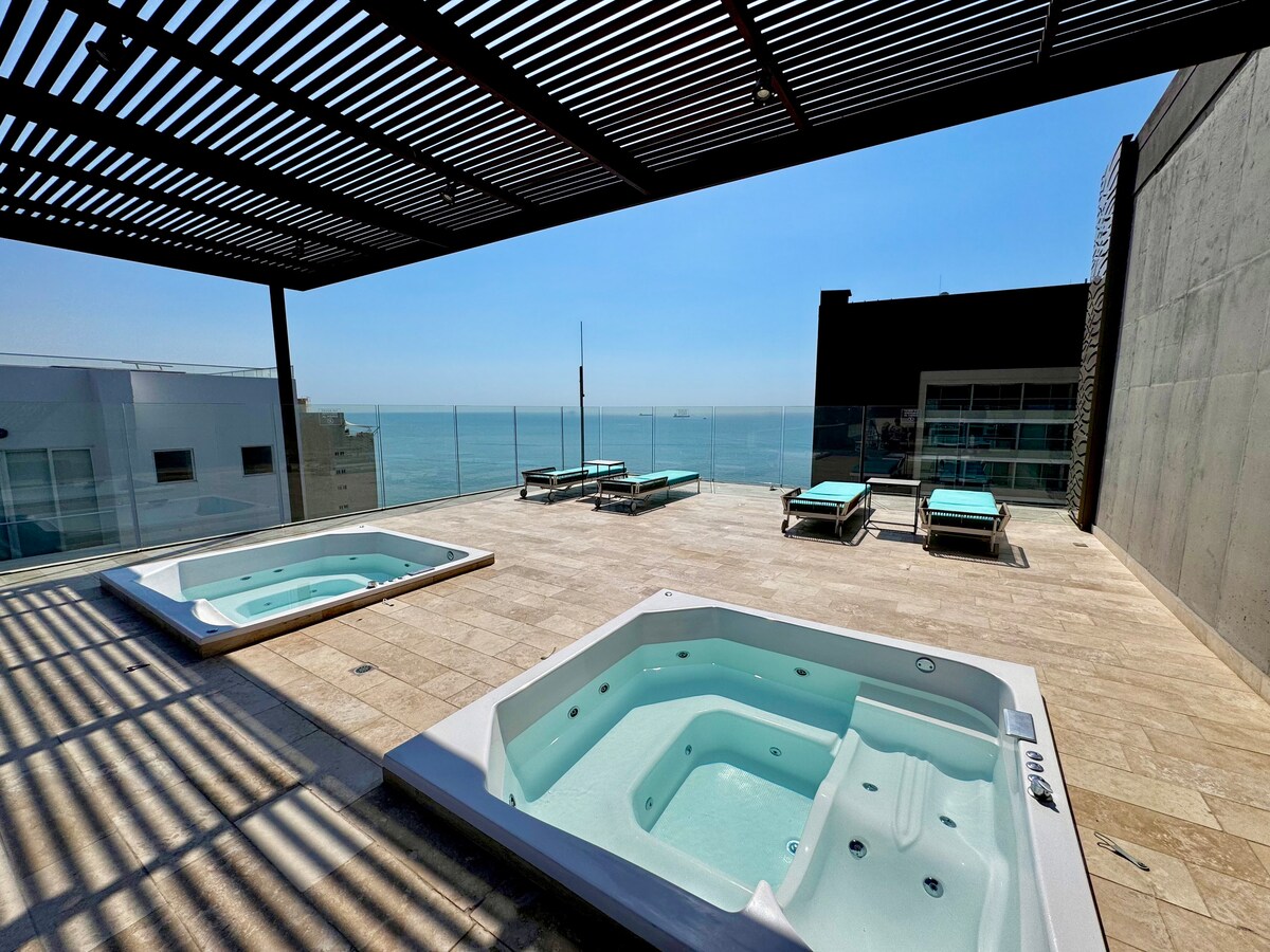 Disfruta una cómoda estancia, con tu pareja o por negocios, en este exclusivo apartamento diseñado para ofrecer equilibrio visual y máximo confort. Inicia el día con una taza de café mientras contemplas el amanecer sobre el mar y termina la jornada relajándote en nuestro jacuzzi privado, apreciando vistas inolvidables. El espacio cuenta con WiFi, aire acondicionado, cocina equipada y acceso ilimitado a las amenidades del edificio: piscina, spa y baño turco. Estamos ubicados a pocos pasos del mar