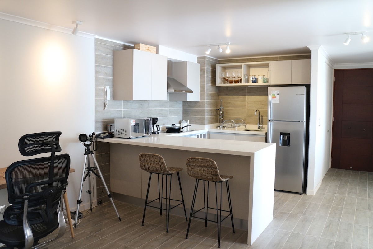 Welcome to "Oasis Costero" A new, fully equipped apartment on the waterfront with an ocean view in Concón. - Outdoor pool available between November and March. - Private parking. - Spacious terrace with ocean view equipped with an electric grill. - Includes bed linens and towels. - WiFi, and a Smart TV. - Fully equipped kitchen. - Safe and quiet area. - Just steps away from Beaches, Restaurants and Bike Paths.