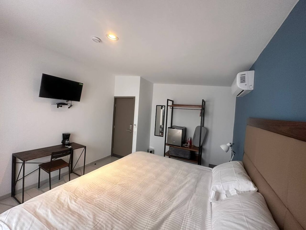 Disfruta tu estancia en nuestra habitación con cama king y balcón. Cuenta con aire acondicionado, pantalla Smart TV, secadora de cabello, clóset, internet Wi-Fi, agua potable rellenable, escritorio, amenidades de baño y tocador, así como agua caliente las 24 horas. Todo en un espacio amplio, seguro y confortable diseñado para tu descanso.