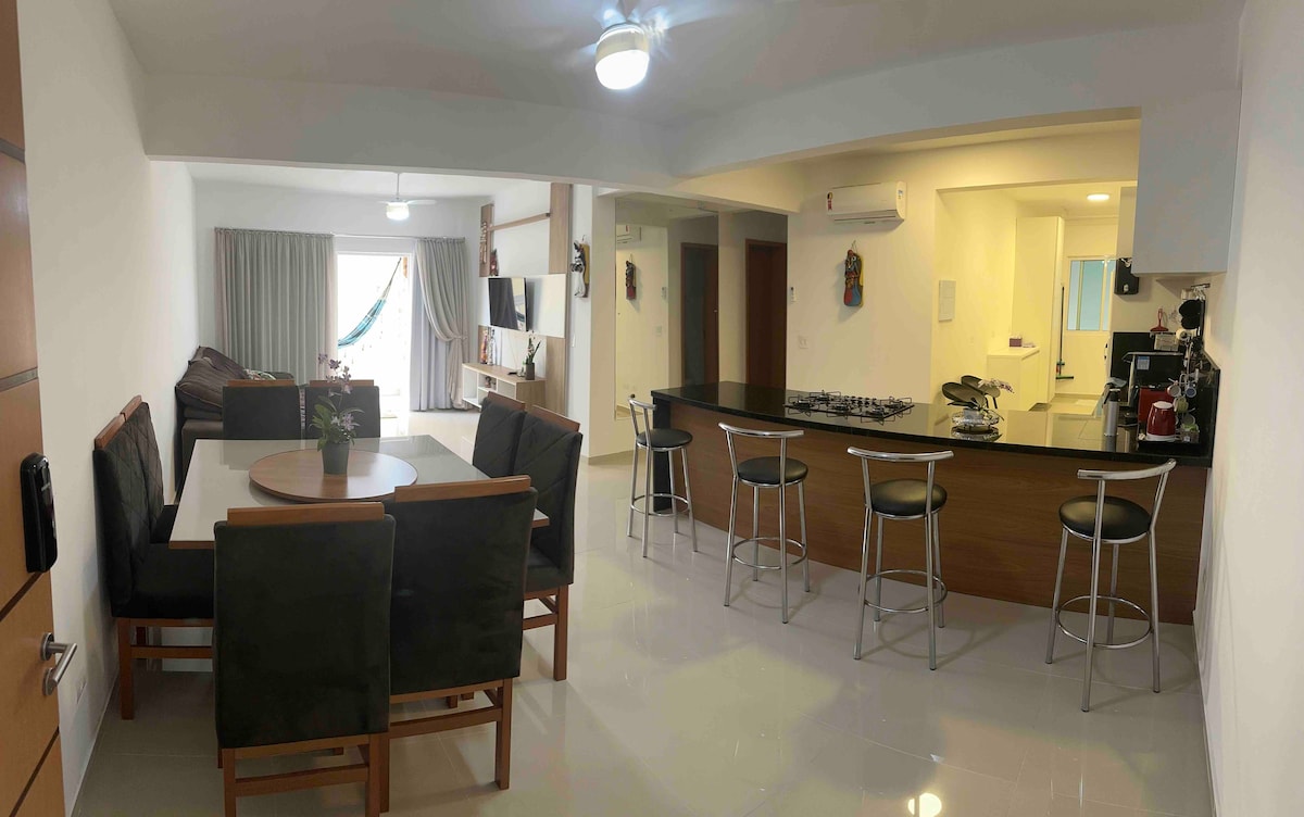 Apto p/ quem quer passar férias em família a 20 mts do mar de Caiobá, c/ vista para o mar. 3 quartos sendo 1 suíte c/ ar e ventilador de teto, cama box maxflex, armário e tv, quarto 2, c/ ar e ventilador de teto, 2 camas de solteiro box que podem ser unidas em cama de casal, armário e tv, lavabo completo, quarto 3 pequeno c/ bicama, ventilador de teto e armário. Sala, cozinha e sacada com churrasqueira integrados c tv smart, Wi-Fi, frigobar e linda vista para as piscinas e o mar perto de tudo.