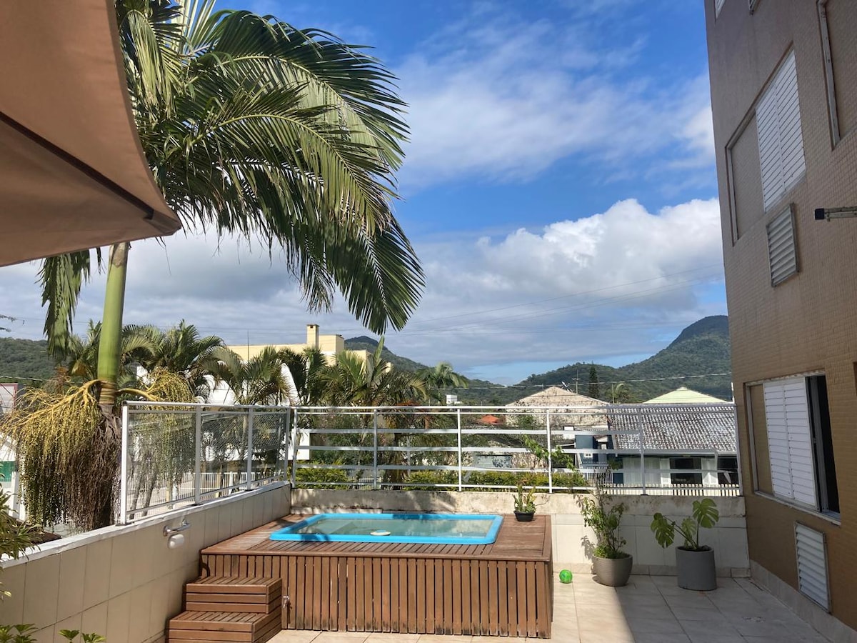 Casa no centro de Matinhos, a 700 metros do mar, com piscina privativa aquecida a 36 °C e área gourmet com churrasqueira. Recebe até 12 hóspedes, com melhor acomodação para 8, roupa de cama incluída e ambientes que atendem bem famílias, casais e grupos de amigos. A distribuição inclui 1 suíte com ar-condicionado, 2 quartos, sala com Smart TV, cozinha equipada, garagem para 4 carros e opção pet friendly, em um espaço pensado para reunir família e amigos perto da Praia Brava e do pico de surf.