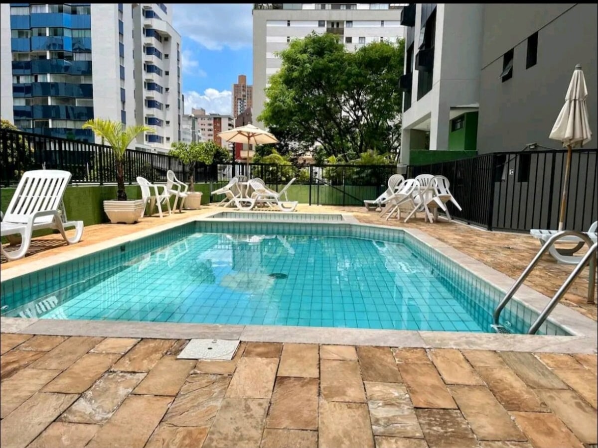 Apartamento bem equipado, com ar condicionado, wi-fi rápido, no melhor e mais moderno prédio da Savassi, o Manhattan Square. Na: Rua Antônio de Albuquerque 894 Perto de tudo e mais alguma coisa, a apenas 2 quarteirões da Praça da Savassi. O prédio é excepcional e tem piscina comparável a de resorts, academia e piscina com raia (para natação) no rooftop, do 23° andar, com vista incrível de BH. Em até 5min a pé é possível chegar em vários cafeterias, lanchonetes, bares, e restaurantes.