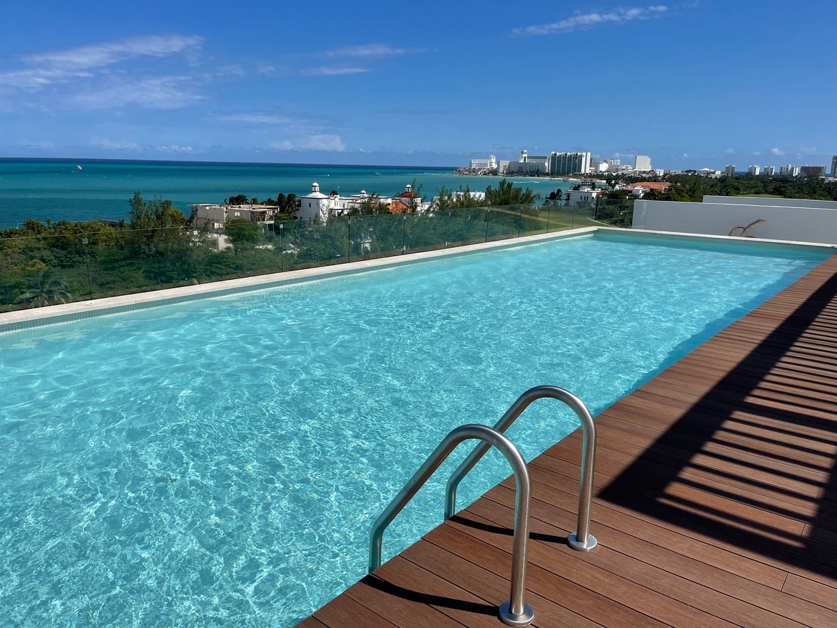 We are located across from Playa Tortugas in the heart of the Hotel Zone with a private rooftop that opens directly onto the infinity pool deck. Enjoy unsurpassed 360º views of Cancun’s turquoise ocean and massive lagoon. Our penthouse is ideal for two but sleeps up to 4 adults and provides many creature comforts. Take a ferry to Isla Mujeres or enjoy the beach right across the street. Bus line out front, party center 5 min ride away. Convenience store and pharmacy on the premises.