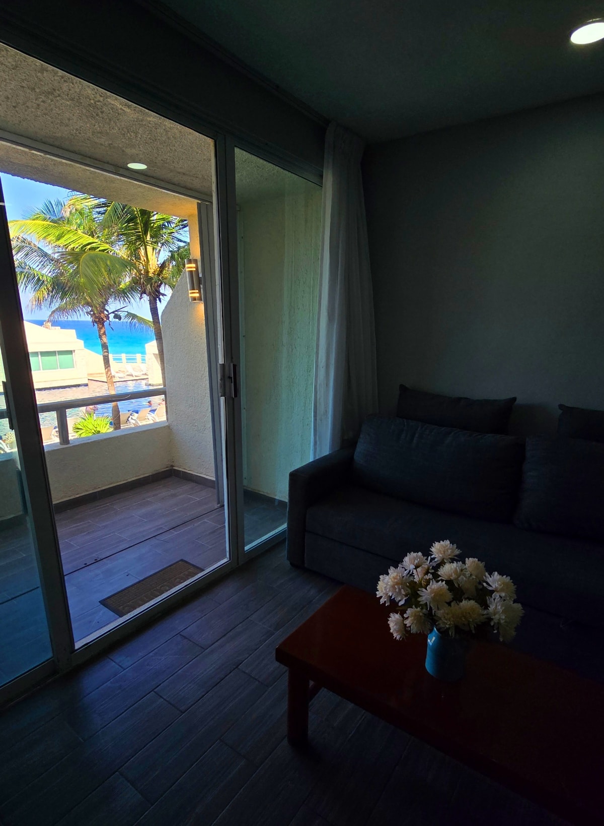 Cosy & well located private studio, with equipped kitchen, in front of the beach in Cancun Hotel Zone. Enjoy your time by the beach and the amenities included: Private access to the beach and the complex amenities such as 2 Pools, 2 Jacuzzis, Kids water area, daily activities. At a special price for our guests, we do provide shuttle a service to or from the airport. The studio does offer a private access to the beach few steps walking through the complex. It offers a partial ocean view.