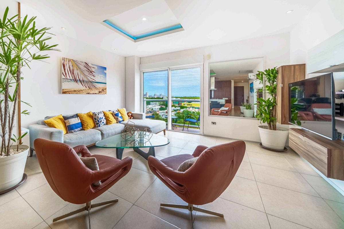 Vive la experiencia de hospedarte en un lujoso departamento de 3 recámaras en Cancún, con espectaculares vistas al parque y la Zona Hotelera. Ideal para familias, grupos o viajes de trabajo, combina elegancia y confort con entretenimiento. Disfruta de una amplia sala con TV de 75” y PlayStation 5, comedor para 6 personas, cocina moderna con barra desayunadora, lavadora y secadora, estacionamiento para 2 autos y una hermosa alberca compartida.