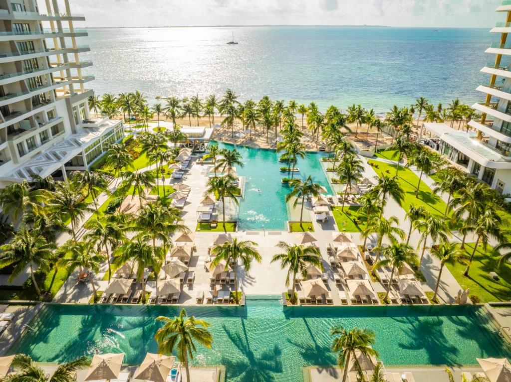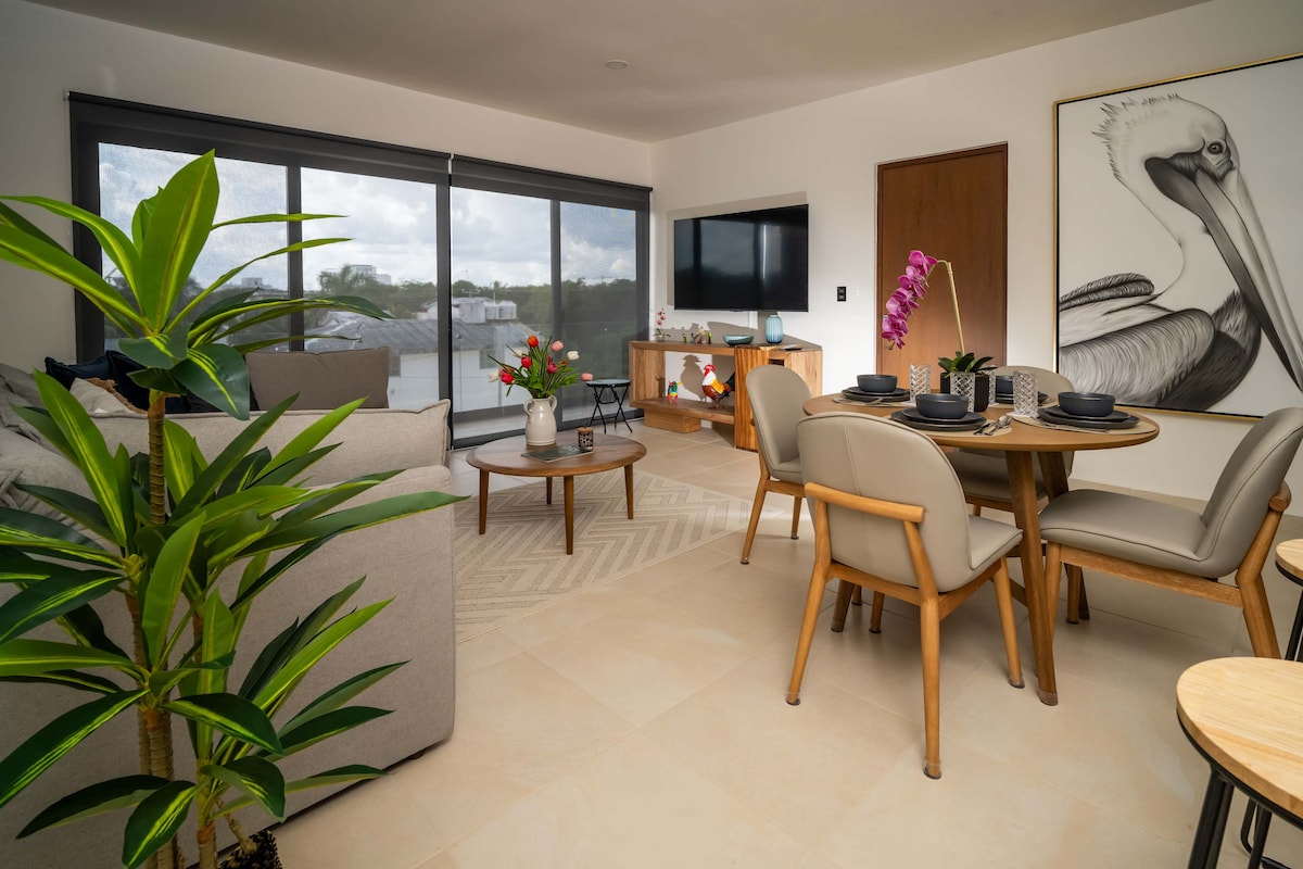Breathe in the fresh ocean air at this coastal escape. The apartment features a slight minimalist aesthetic, wood furnishings, an open-plan living and dining area, and access to shared amenities including a gym, patio lounge, and an infinity pool. @naimacancun
