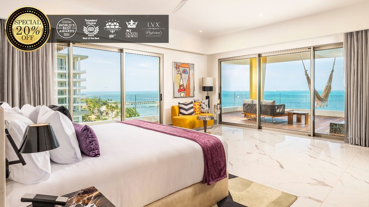 Escape to Villa Mara, a luxurious adults-only retreat in the heart of Cancun's Hotel Zone. This stunning villa boasts nine exquisitely designed suites, each with a king- or queen-size bed, air conditioning, and a Smart TV, comfortably accommodating up to 18 guests.