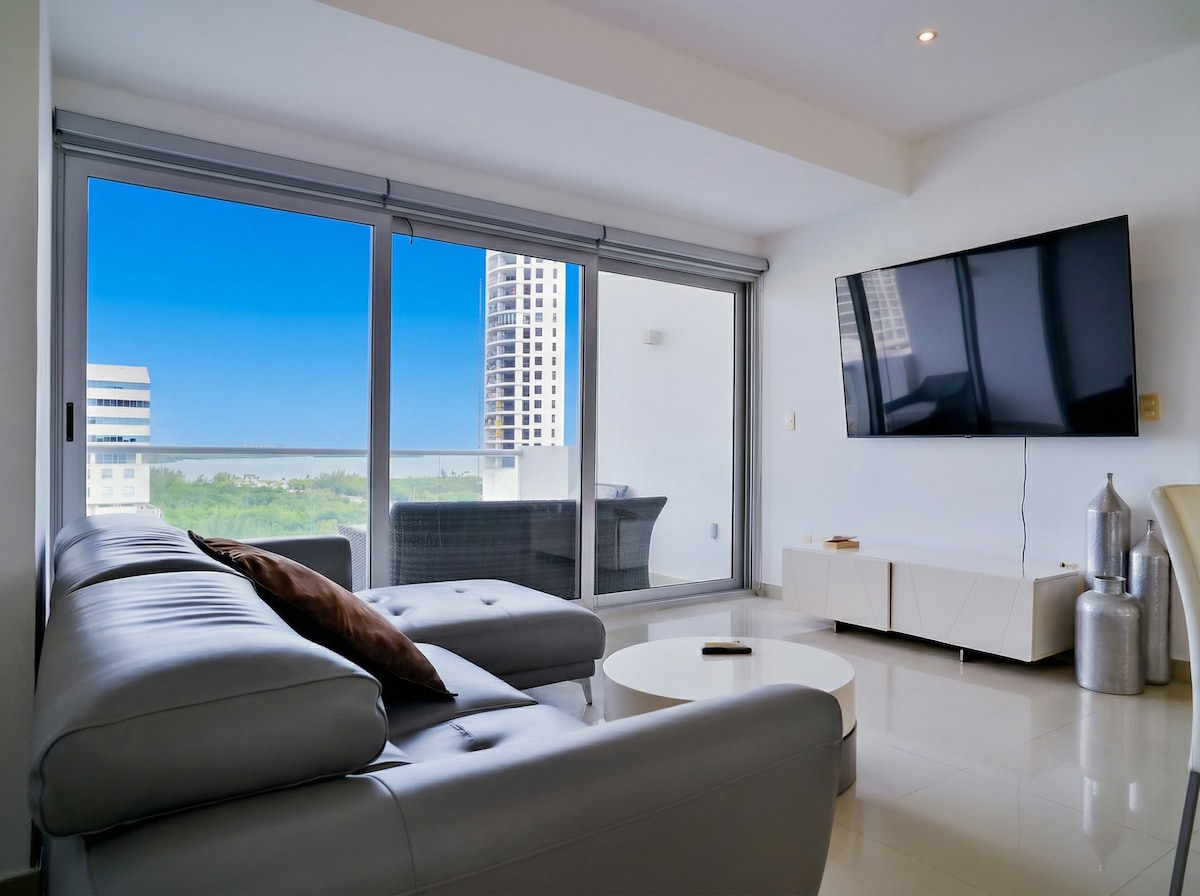 Beautiful Luxury apartment in Puerto Cancun, Hotel Zone, the most exclusive area of the city. Located with a beautiful view of the turquoise blue waters of the Caribbean Sea. Decorated in every detail, your stay will be very pleasant. It has all the necessary services, private parking, access with code and an enviable location! the condominium is connected to the Marina Puerto Cancun Shopping Center and you can walk down to find restaurants, shops, entertainment, etc.
