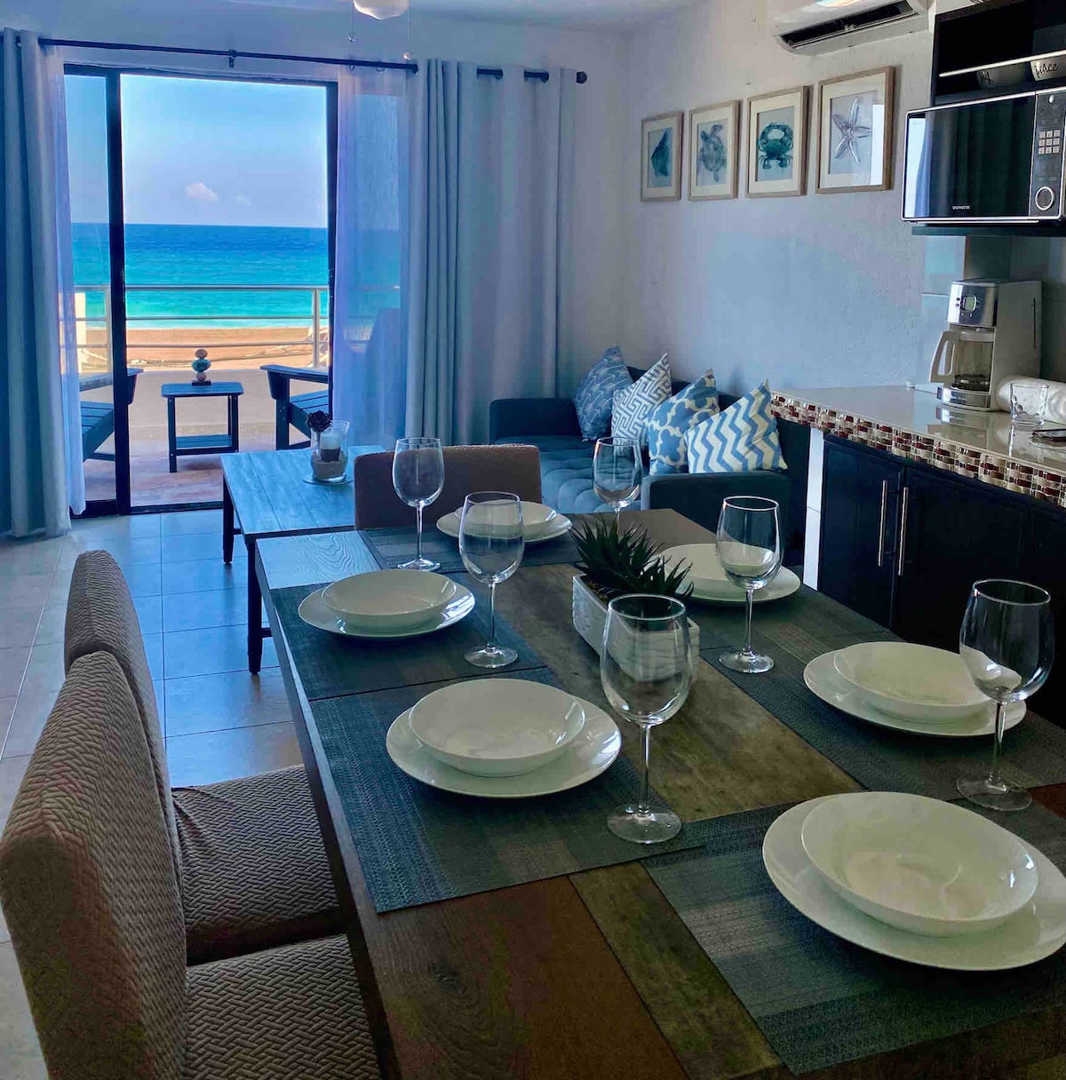 Stylish studio with amazing views, located in a 3 tower condo-hotel, pristine private beach, turquoise water, white sands. Huge wrap around balcony ocean and lagoon view. High speed Wifi, A/c, Smart Tv , safe. Lounge chairs and tents for free at pool and beach. Gym, tennis court, Coffee shop at lobby. Spa (with extra fee) Flexible All Inclusive Option for food and drinks -Pay only for the day(s) you want it-. Decide as your vacation unfolds.(today $95 usd p/p per day) ideal for couples