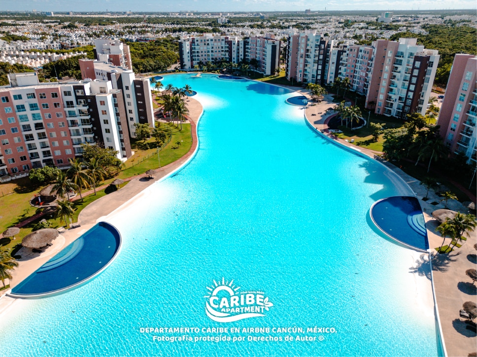 Departamento amueblado con hermosas vistas laguna y albercas. Amenites: Laguna artificial para Kayacs, 7 Albercas tipo infinito, Pista circuito para ejercitarse, juegos infantiles, Palapas con camastros ergonómicos, Terraza para fiestas, Gimnasios al aire libre, Area de resguardo para kayacks, Seguridad y Acceso controlado las 24 horas, estamos a 15 minutos del aeropuerto de Cancún, también contamos con camionetas familiares.