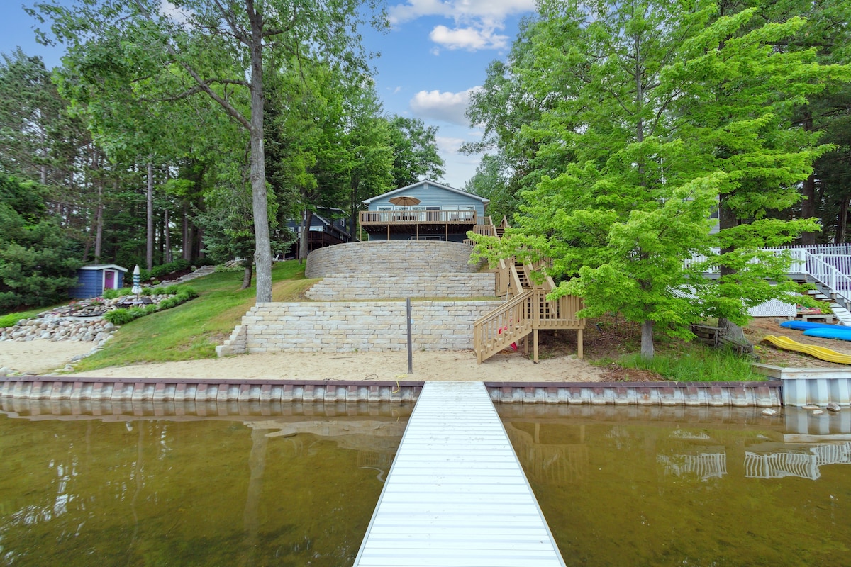 Pure Michigan experience starts with a tiny Paradise Lakefront Cottage plus extra bonus! The Love Shack! Huge beach private !crystal clear water!! Swimming sunbathing floating on the lake! Outsidefire pits on a beach the stars are gorgeous at night next to the gazebo with double bed!! outdoor tiki bar!! front porch with a picnic table! BBQ Grill got a big dock 3 feet by 30 bring your own boat jet ski the lake connect 5 different lakes it comes with free 4 kayaks! cruise around the Lakes!