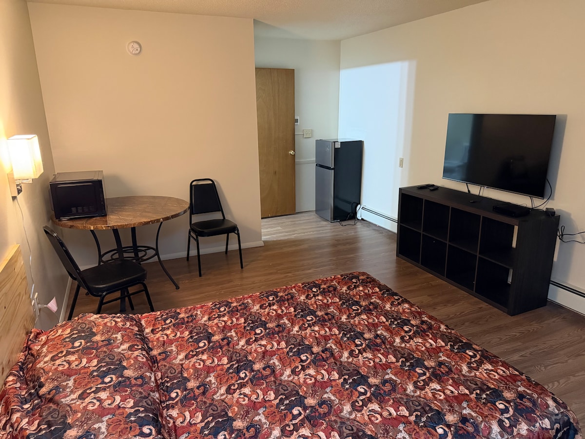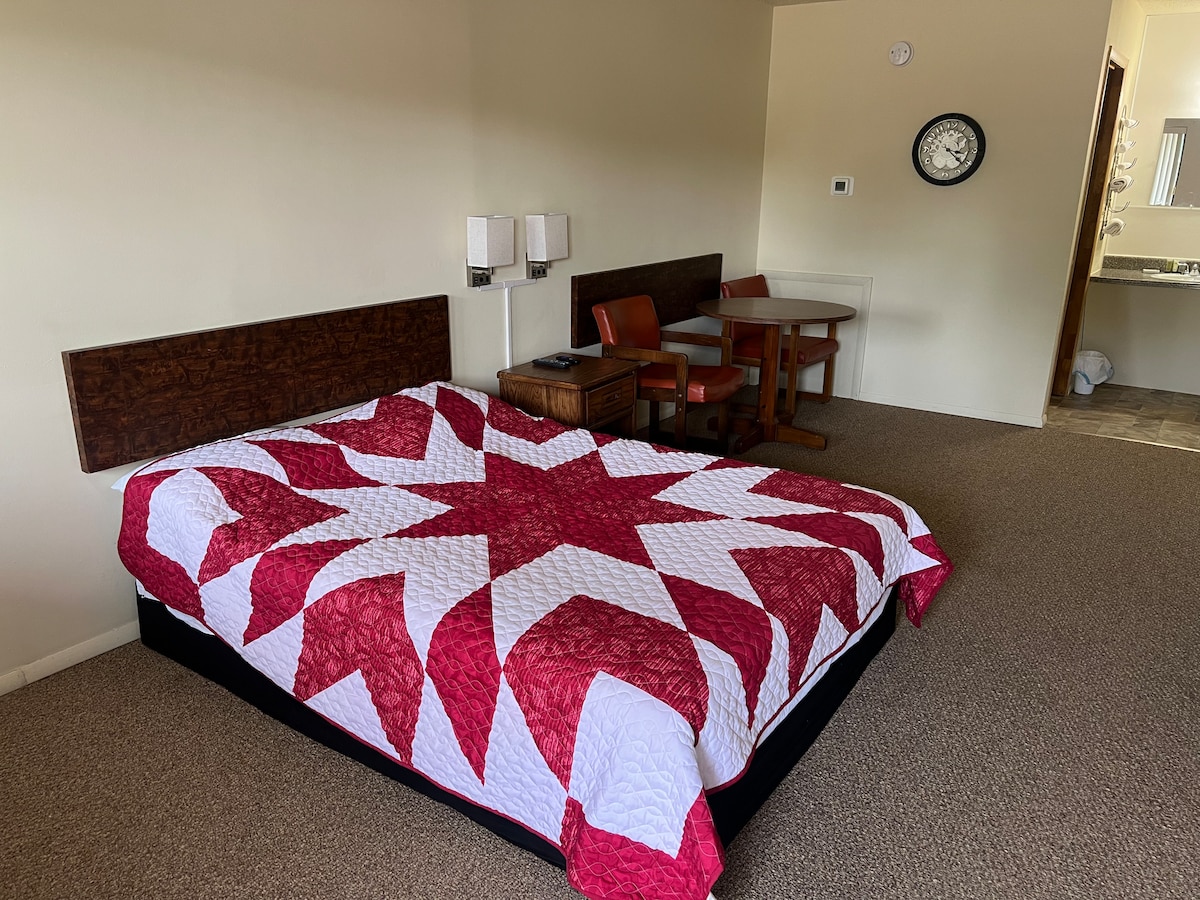 Step into the recently updated room, where contemporary comfort meets tasteful design. As you step inside, you'll be greeted by a spacious and inviting atmosphere. The centerpiece of the room is a plush king-sized bed adorned with crisp linens, promising you a restful night's sleep. Every room has free WiFi, TV, a mini-refrigerator, a microwave, a one-cup coffee maker and supplies; all equipment, furniture, and beds are brand new in 2024.