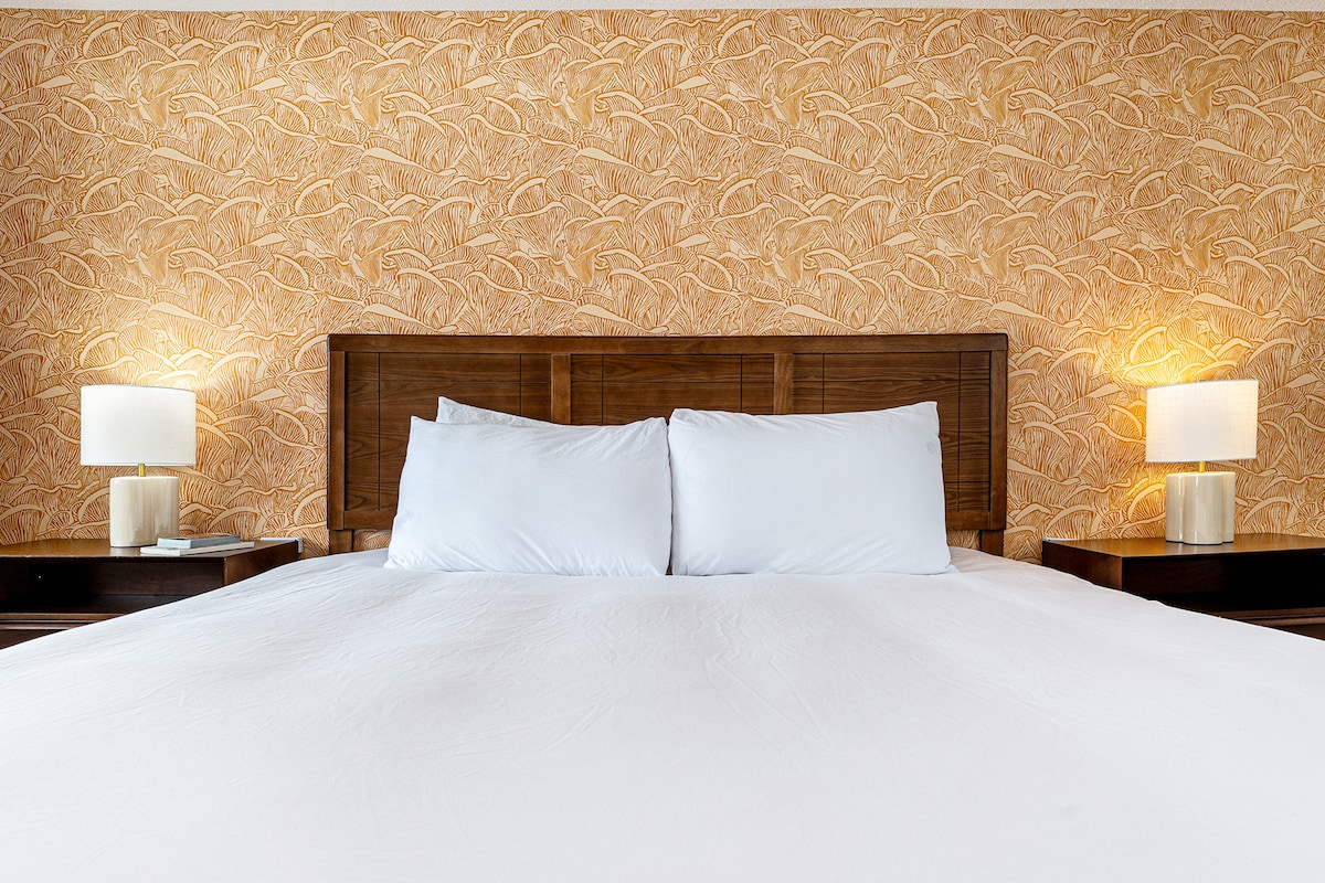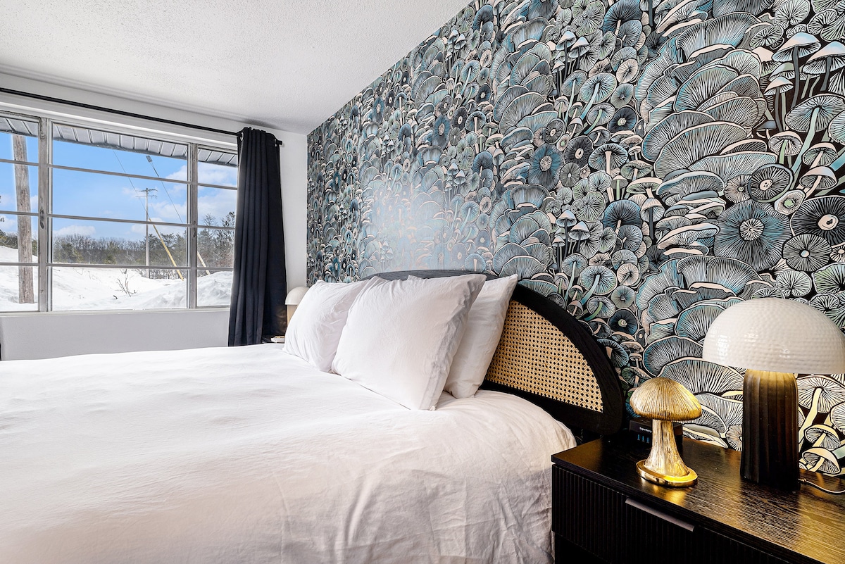 Welcome to The Fern, a cozy (2) queen bed hotel room hideaway at The Windmoor Lodge. With stylish wallpaper, cozy textures, and a retro-cool vibe, it’s your basecamp for a relaxing up-north getaway. Listen to the Marshall speaker, crack open a local read, and sink into fresh white sheets. Steps away: hot tub soaks, fire pit laughs, pickleball, basketball, sauna, and sunset swings. It’s a vibe, no seriously, the reviews say so. Soft, social, and seriously photogenic.
