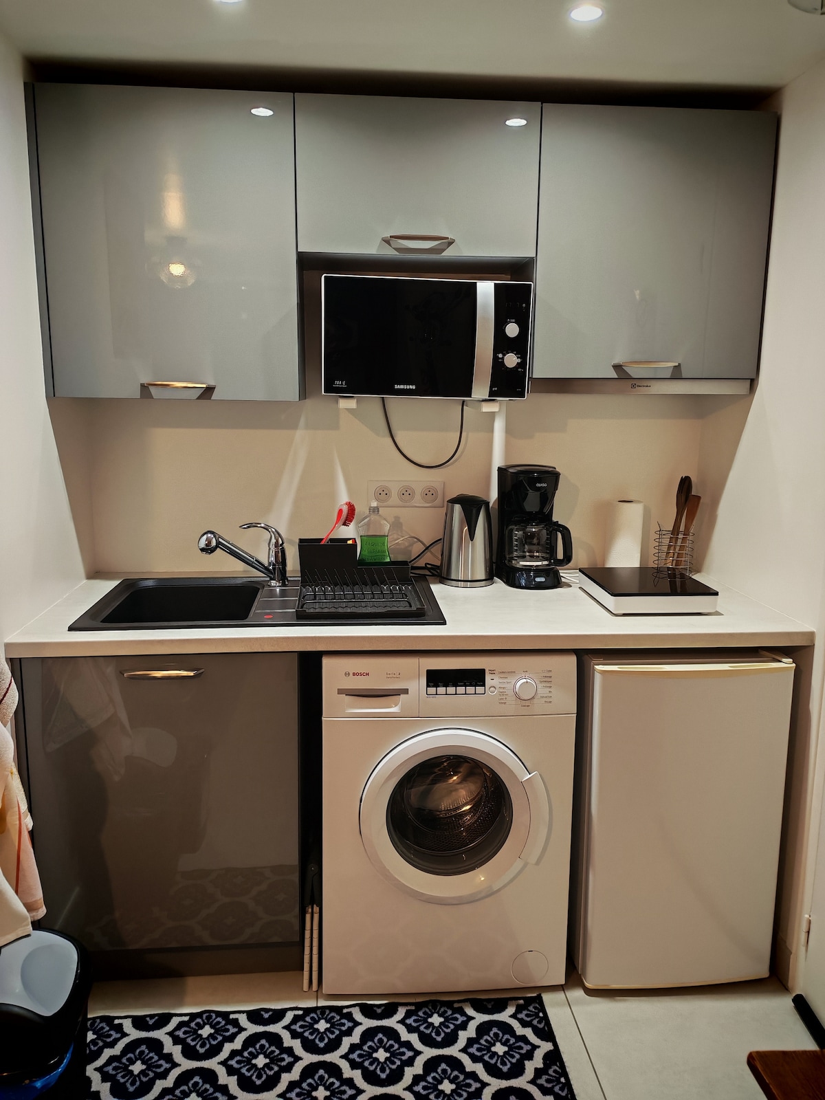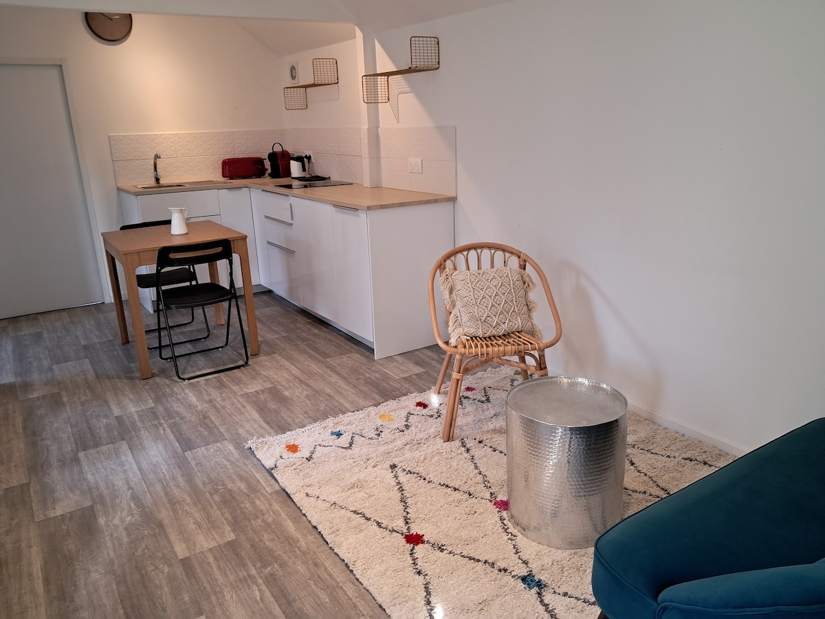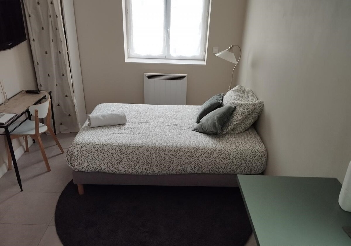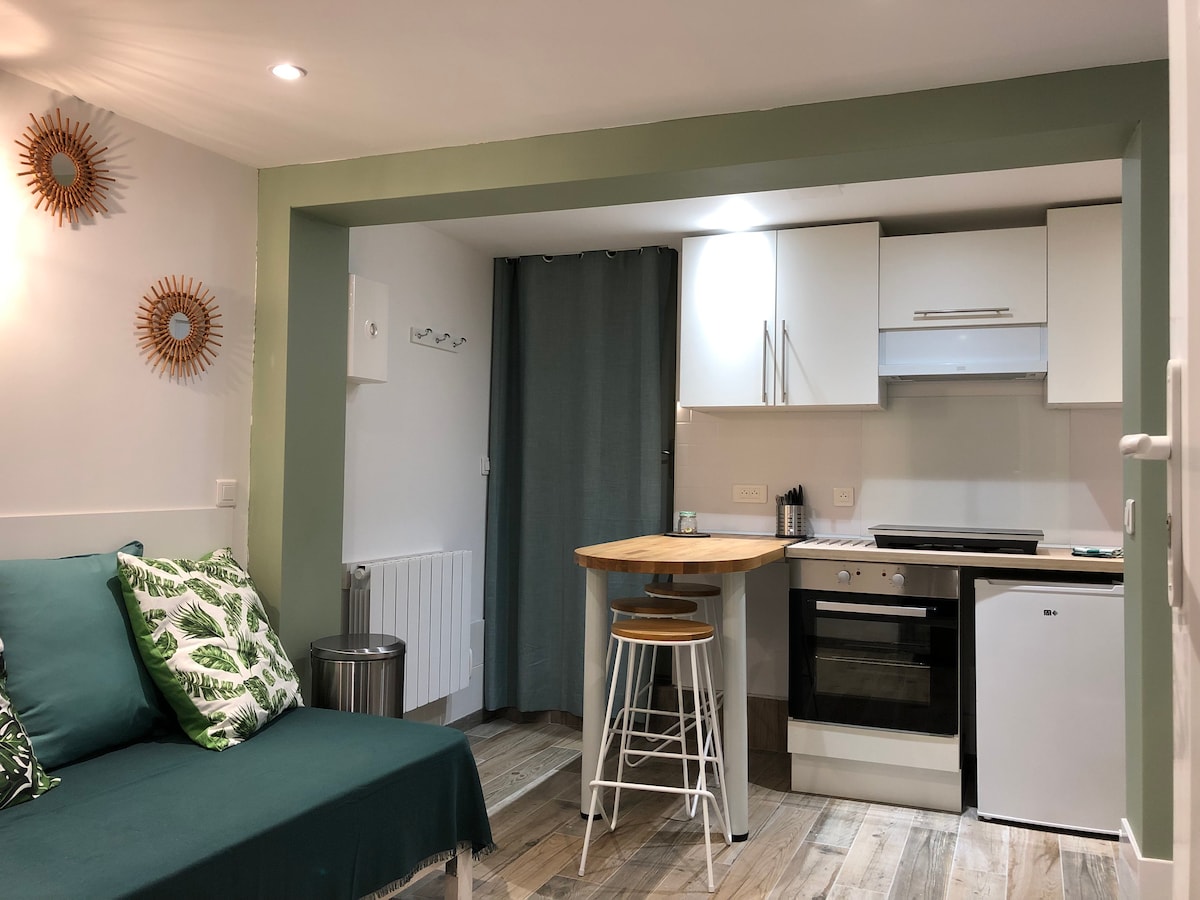 The housing «Jade» is a cocoon of 23m², quiet, soft and colorful decoration, and located in a neighborhood where you will feel safe. Housing completely independent of a house in which we live, it is located 5 minutes walk from the station of Houilles. The apartment, with a ceiling height of 2m10, is composed of three rooms well proportioned : a sitting area and a fully equipped kitchen in the same volume, a bedroom, and a bathroom.