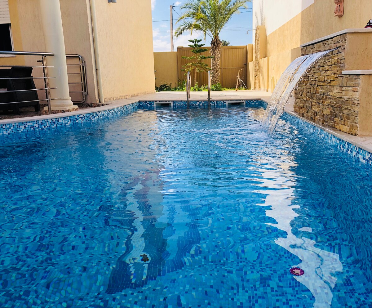 Belle villa Djerbienne de 300 mètres carrés comprenant 6 chambres climatisées et 4 salles de bain, une grande pièce à vivre, cuisine américaine bien équipée et cuisine extérieure couverte avec barbecue. Buanderie équipée d'un lave linge, belle piscine privée sécurisée équipée d'un pergolas accessible depuis la grande terrasse, très beau patio avec une jolie fontaine au milieu. Alarme pour votre sécurité, portail automatique avec un accès privé, internet gratuite et en illimité.