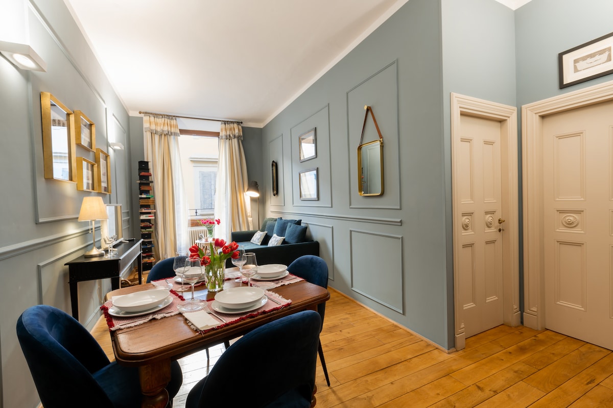 Luxurious apartment in the heart of Florence, on the first floor (no elevator) of a prestigious historic building next to Loggia Rucellai and facing the iconic Palazzo Rucellai. Located on Via della Vigna Nuova, one of the city’s most elegant and sought-after streets. Perfectly positioned within easy walking distance of major attractions, this refined space blends historic charm with contemporary comfort, featuring high ceilings, large windows and carefully curated décor for an elegant stay.