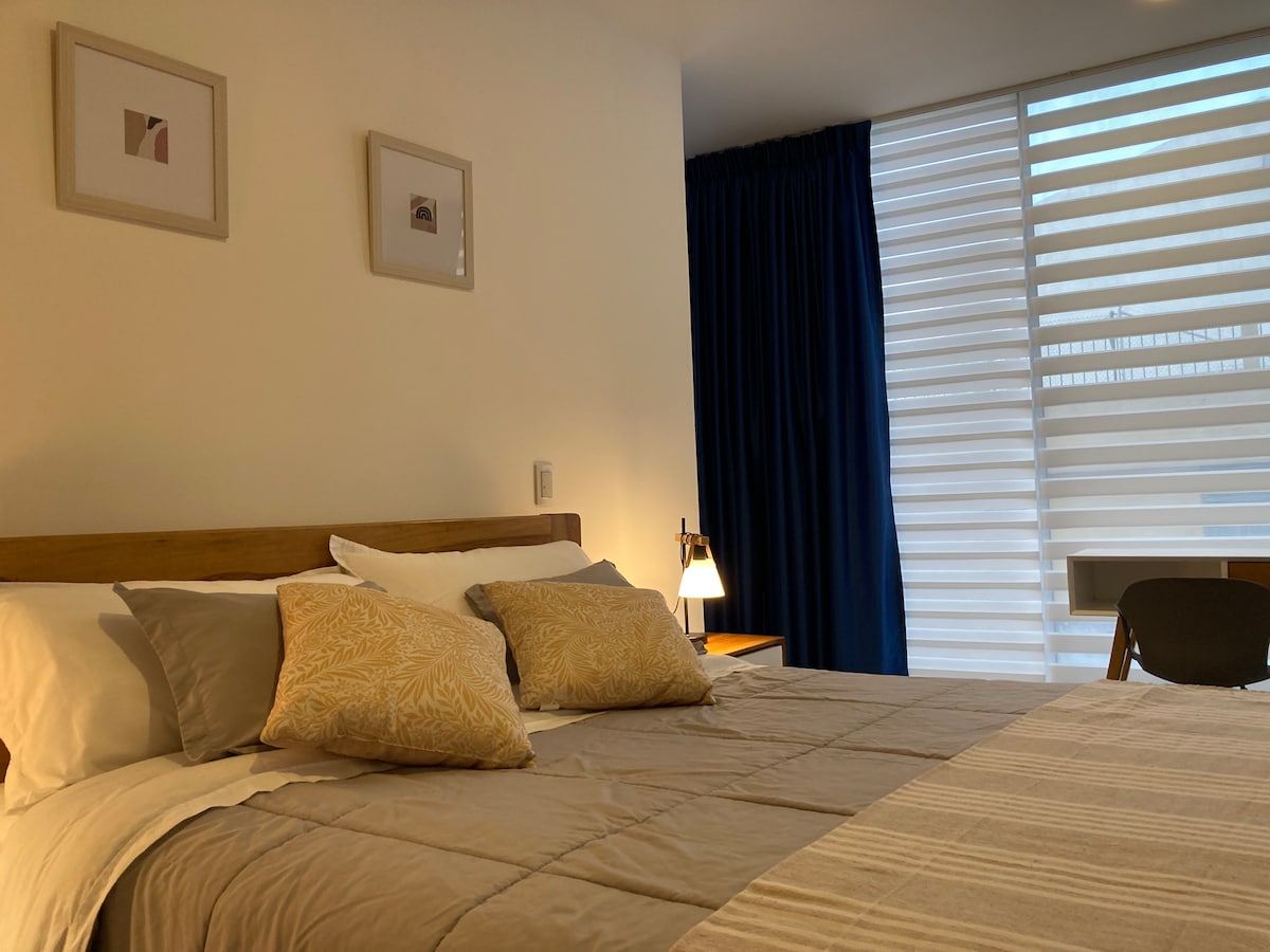 Minimalista y con todo lo necesario para una estadía larga o de pocos días. Pensada para que nuestros huéspedes tengan todo lo necesario para una estancia placentera. Cuenta con todo lo necesario para cocinar, o si se trata de entretenimiento, un monitor 4K en la sala y otro en la habitación. Silenciosa, acogedora, íntima y apacible. Su ubicación perfecta rodeada de universidades, hoteles, restaurantes, zonas turísticas, y la terraza con hermosa vista, la convierten en un destino en sí misma.