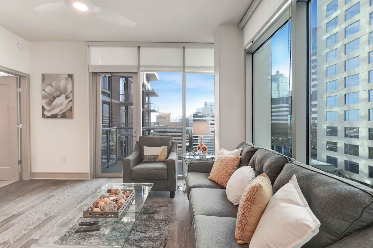 The Modern Chic is a curated luxury unit offered by The High Rise Collective in Houston. This stunning 2 bedroom 2 bath high rise apartment offers a professionally designed interior with luxurious amenities such as an infinity edge pool, spacious gym, and much more. Located in the heart of the Texas Medical Center, this unit offers direct access to the Buffalo Bayou running trails. There is also easy access to Rice University, The Houston Zoo, Hermann Park, Museum District, and NRG Stadium.