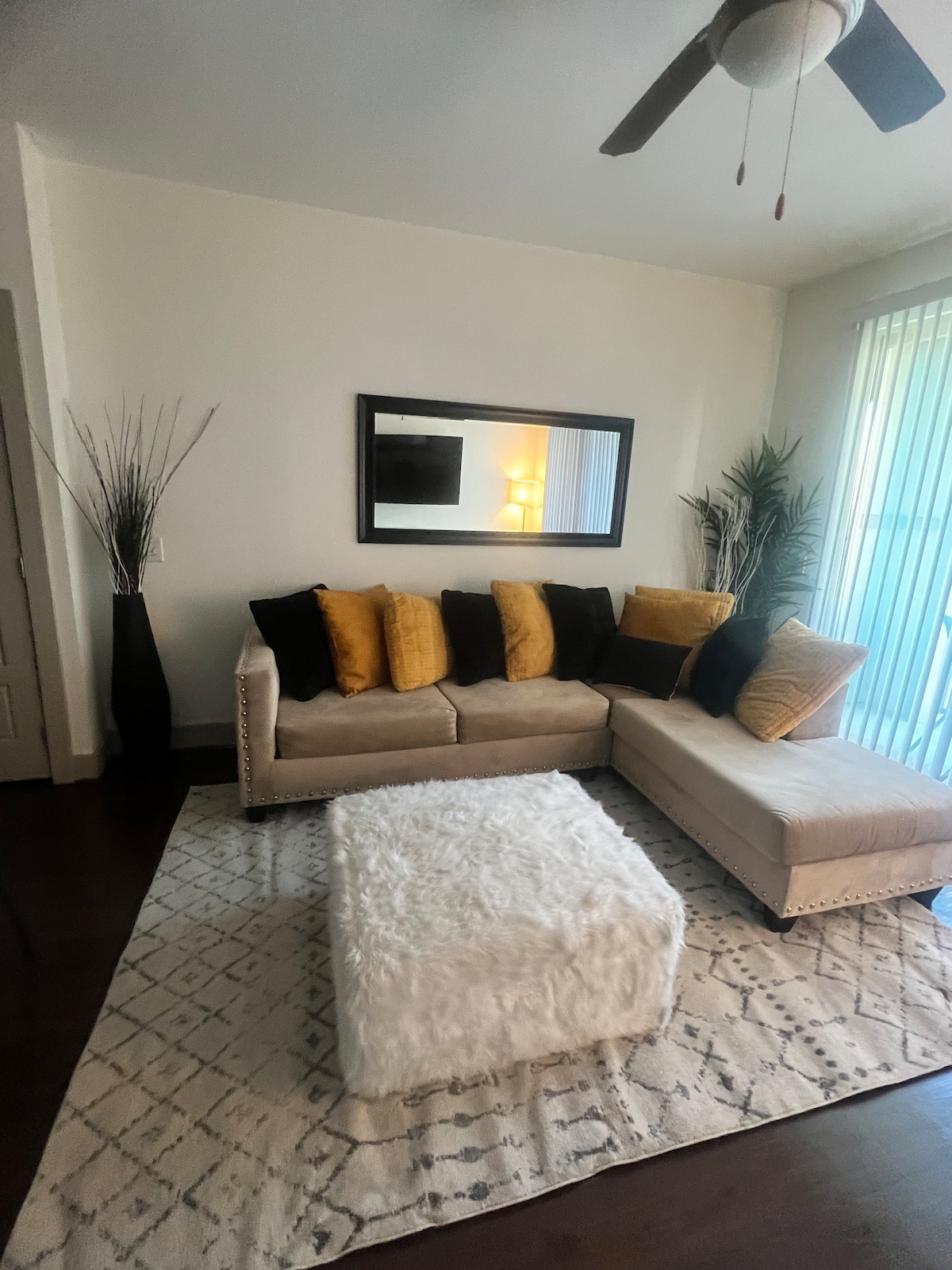 Experience Houston in a spacious modern apartment with great vibes and amenities. The Unit: → Lightning Fast Wi-Fi → Comfortable King Bed → Dedicated Workspace + Monitor → 55" Living Room Smart TV → 50” Bedroom Smart TV → Fully Stocked Kitchen → Washer & Dryer → Private Parking (Park at your own risk) The Amenities: → View and Lounge → Pool + Spa → Full Size Gym Ideal for Texas Medical Center visitors, healthcare trainees/workers, travel nurses, and business travelers.