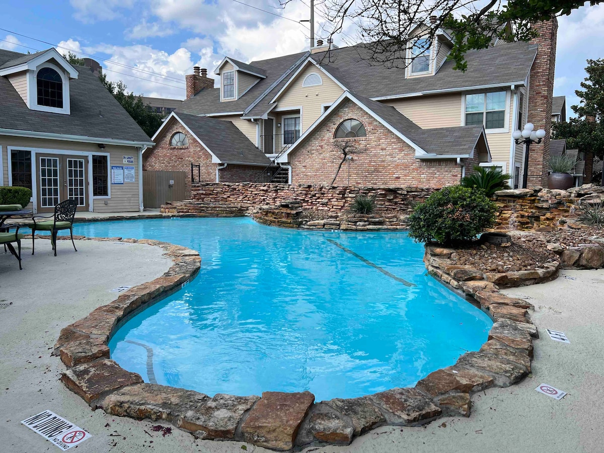 豪华特大床1卧室,免费停车,泳池,市中心HTX