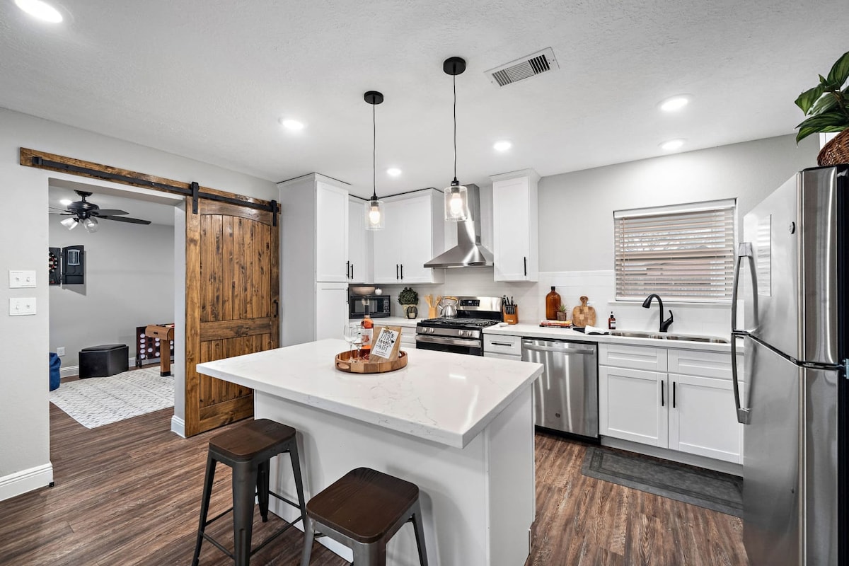 Relax at this upscale modern getaway featuring a massive private yard ★ 3 Cozy Bedrooms | 1.5 Modern Bathrooms | Accommodates 9 Guests ★ Fun Game Room: The perfect indoor hangout space for your group ★ Wide Backyard Oasis: Plenty of room for kids and outdoor games ★ Covered Porch Parking: Safe and convenient front-of-house entry • Modern style | Family-centric | Complimentary essentials • Fast internet | Remote-work ready • Fresh linens | Full Laundry