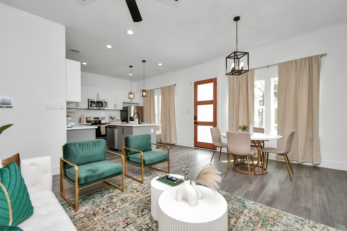 A secure private gated and tranquil modern home minutes from the medical center/MD And, NRG, Downtown, TX Children's and nightlife. The home is spacious, open floor plan, two seating areas, fireplace and smart TV's. The dining space has a table for seven. The Kitchen is fully equiped with dinnerware and glasses. A Bar Table with 4 Bar Stools for extra guest seating. Relax on the furnished covered patio with TV, Games, BBQ grill. Enjoy views of a large, plush landscaped backyard.
