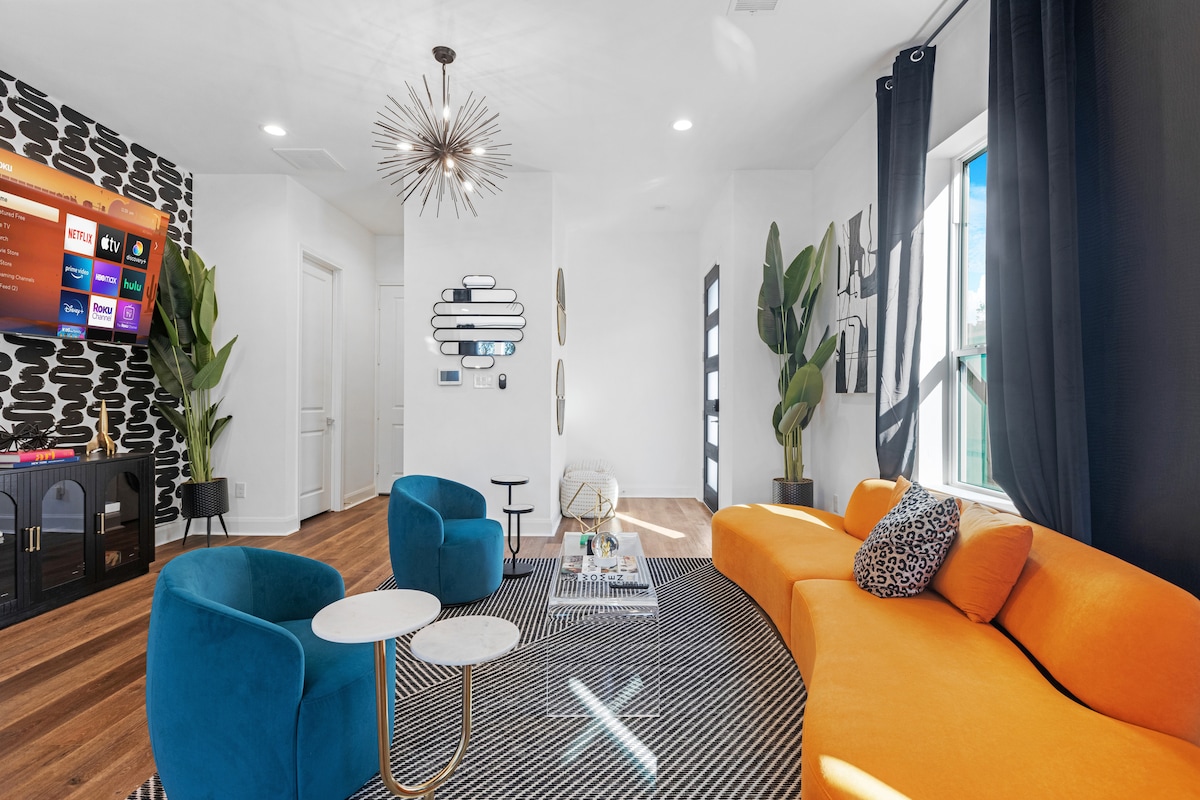 Clean home, beautiful decor, original artwork, gated parking/EV, central arts‑district location, fast WiFi. Enjoy luxury comfort in a central location near downtown Houston. • 5 min drive to downtown • 10 min to Galleria • 15 min to Medical District • Gated driveway • Full kitchen with cooking tools • Crib/high‑chair • 1 Gb/s fast internet • YouTube TV w/ ESPN, NFL Network, CNN, Univision • 65" TV in the living room and a TV in each room • Complimentary toiletries • Rain-shower "spa bathrooms"