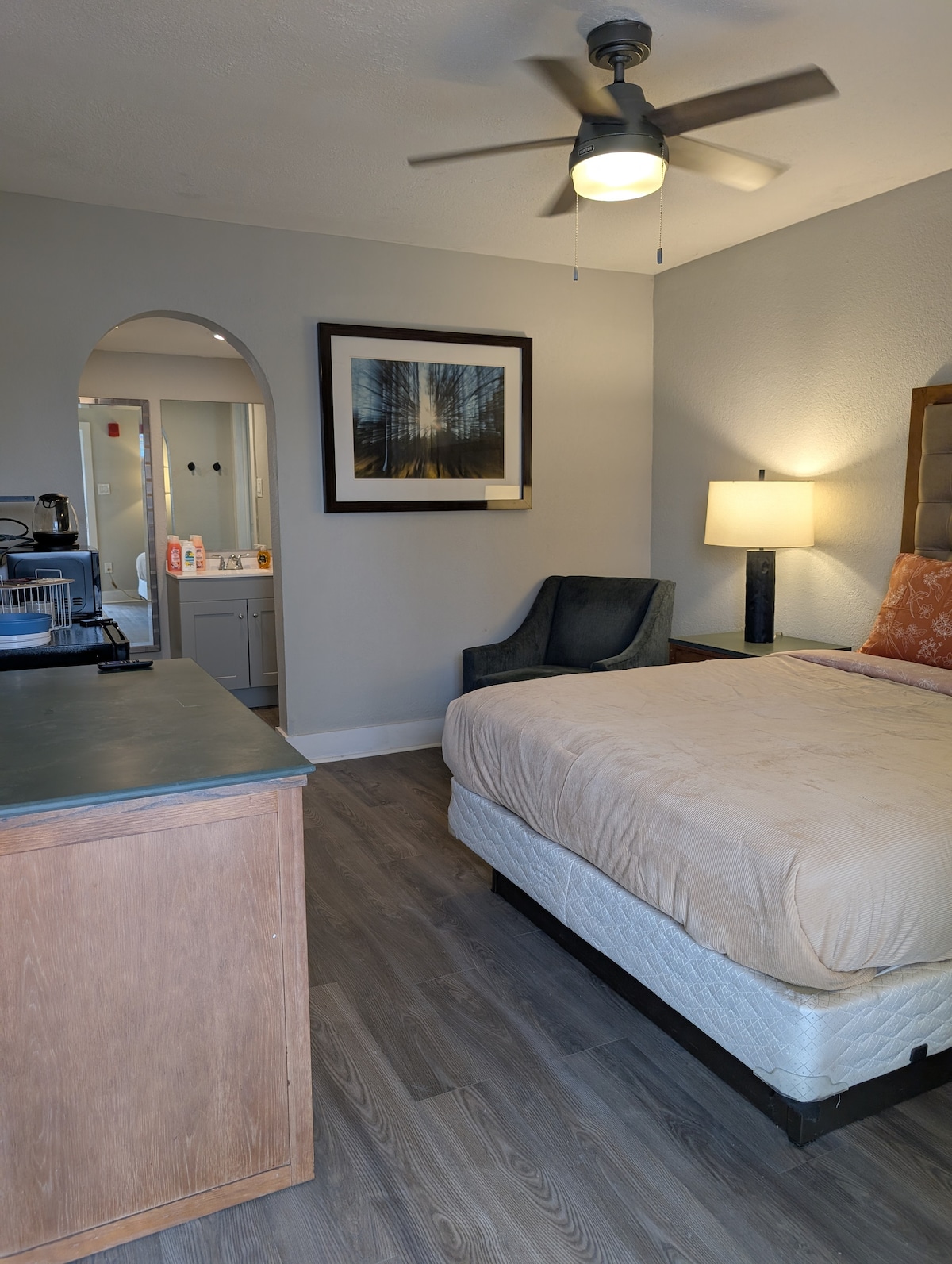 Relax in our One Bedroom King Suite, featuring a separate living area and a luxurious king-size bed for ultimate privacy and comfort. Elegant furnishings and modern amenities provide ample space to unwind or entertain, perfect for extended stays or special getaways. Enjoy a restful night’s sleep and all the comforts of home in a refined, welcoming setting.