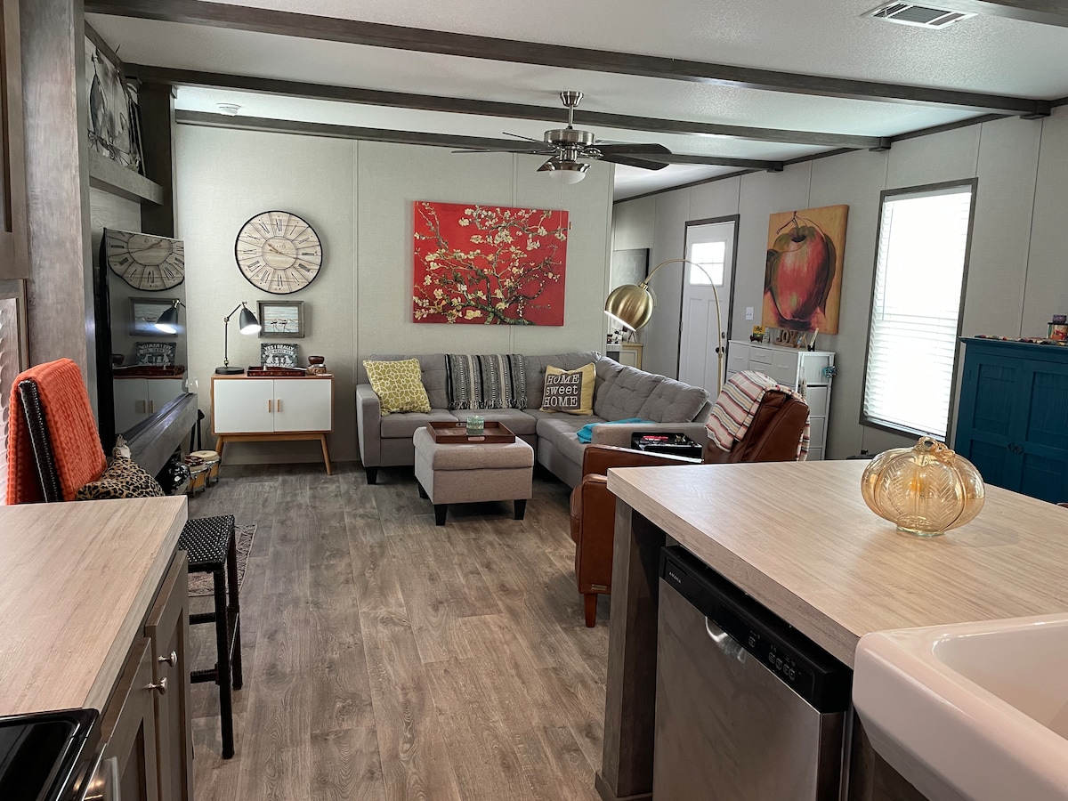 This tiny house is just 5 minutes from I-45 in The Woodlands / North Spring area. It is tucked away under large trees in a heavily wooded neighborhood that makes it a quiet getaway from the noise of the city. The Woodlands is a 10 minute drive north and the IAH airport is only 25 minutes South. Spring Creek is a 5 minute walk away. This efficiently designed tiny house has a queen bed in the loft and the corner sofa turns into a full size bed. It has a full kitchen and shower.