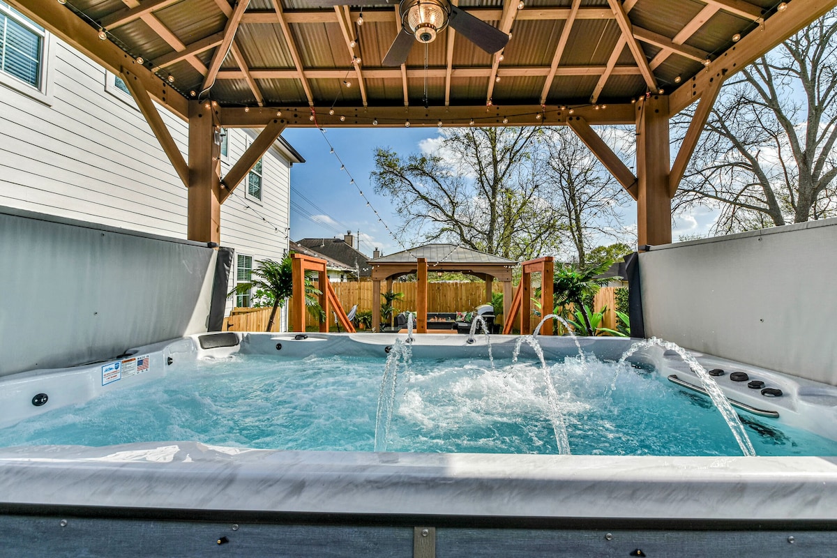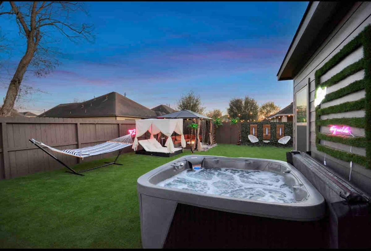 Revel in the stylish design of this recently renovated 5BR 3.5Bath spacious oasis immersed in a tranquil and friendly neighborhood. It offers a luxurious getaway 30 minutes away from Downtown Houston, Medical Center, top restaurants, shops, attractions, and landmarks. ✔ 5 Comfy BRs ✔ Hot Tub & Theater room (Steam and Stream!) ✔ Open Design Living ✔ Fully Equipped Kitchen ✔ Backyard ✔ Office ✔ Smart TVs ✔ Fast Tesla Charger ✔ High-Speed Wi-Fi ✔ Free Parking
