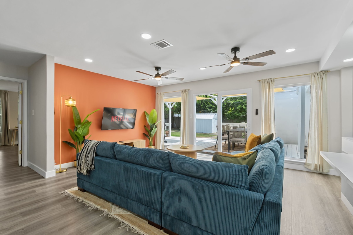 Enjoy a perfect getaway in a cozy, modern and updated house located on a lot of more than a 1/4 acre with a 9ft deep pool, wet bar, spa,grill and lounge area. Beautiful and colorful night lights with lots of privacy in pool and patio area. The house is spacious and comfortably sleeps 10 people . 😊 with state of the art brand new furnitures, beds and mattresses. House comes with all appliances including washer, dryer and 3 smart tv's and equipped with high quality linen and kitchen essentials.