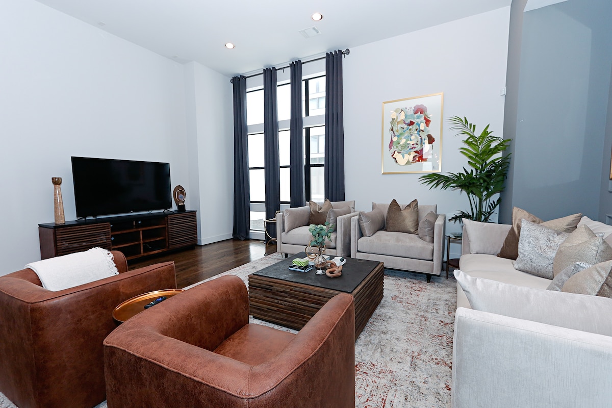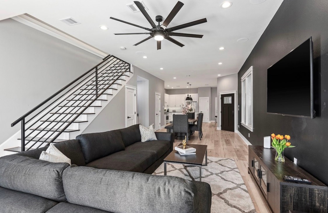 Take it easy on the covered 2nd-story patio, then hang out in the open kitchen and dining space under exposed ducts and dramatic black rafters. The double shower head glossy white bathroom and ghost chairs add a futuristic edge to this urban abode's loft vibe. Unwind on the acclaimed ultra deep sectional with a plush blanket and catch up on your favorite shows or movies. Many points of interest are reachable within minutes.