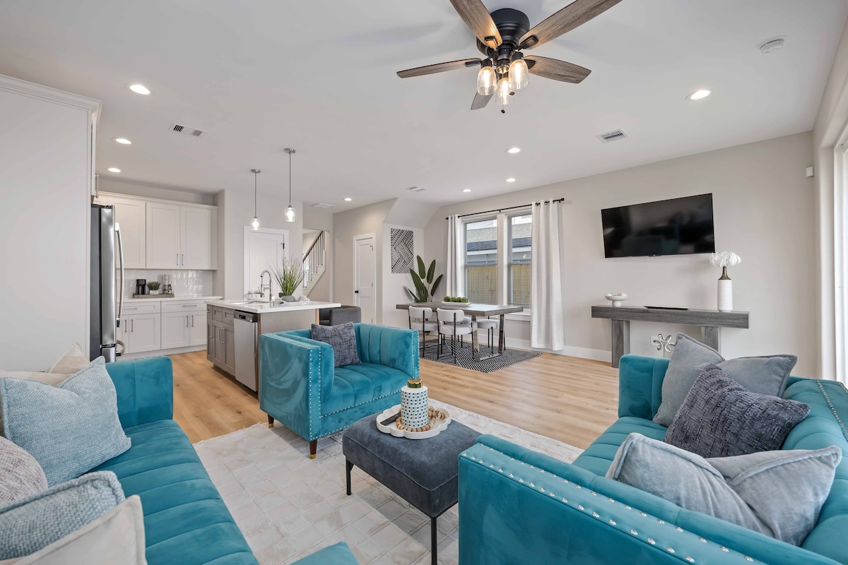 Experience luxury in this Houston townhouse with 3 bedrooms, each with a private bath/TV. The smart home has automated locks, lights, vacuums, and thermostats. The 2nd floor is an open-concept space with a kitchen, dining, and living area featuring an 85" Samsung TV, pool table, board games, and mini bar. There’s a small workstation in the downstairs bedroom and an office space with a full work setup. Enjoy the backyard seating area. Located under 5 miles from NRG Stadium and Minute Maid Park.