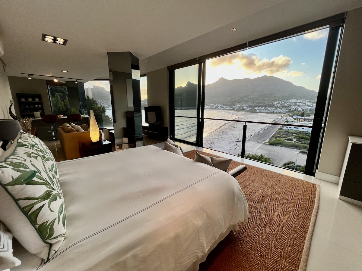 Our studio apartment opens up onto a 40sq meter balcony with a panoramic view of the Hout Bay Valley and the Helderberg mountains beyond. Large sliding doors disappear into the walls creating an unimpeded indoor/outdoor flow while the elevated position protects your privacy. The open plan bathroom faces onto an enclosed secret garden which includes a frame-less glass shower. The unit has a fully equipped kitchenette and is serviced daily except weekends and public holidays.