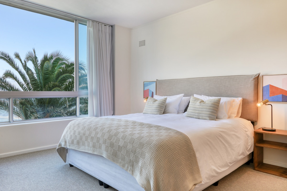 在海浪声中醒来。现代、宽敞、海景