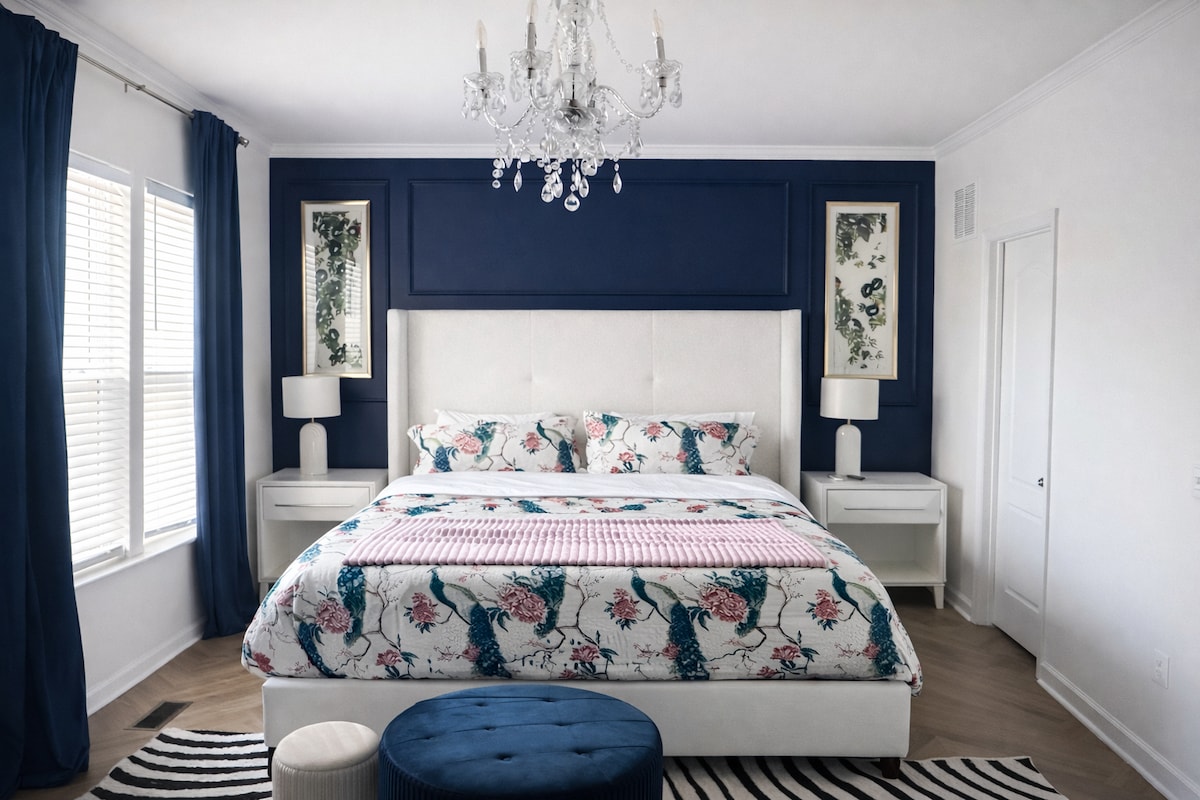 Room is upstairs (REAR on the RIGHT) 32" SmarTV (Peacock, PBS, Paramount+, Netflix, Amazon, Apple, Disney+, DirecTV & DVR), & bedroom Kuerig. Spa (kept at a maximum of 104 degrees year 'round)--required 48 hours advance notice for use. NO lock on bedroom/bathroom---doorstop provided. NO parking in parking spaces, park on Grand Bend Dr (straight part only)--approx. 50' from the property. NO shoes in the house; socks or slippers are welcome! NO eating in the bedroom.